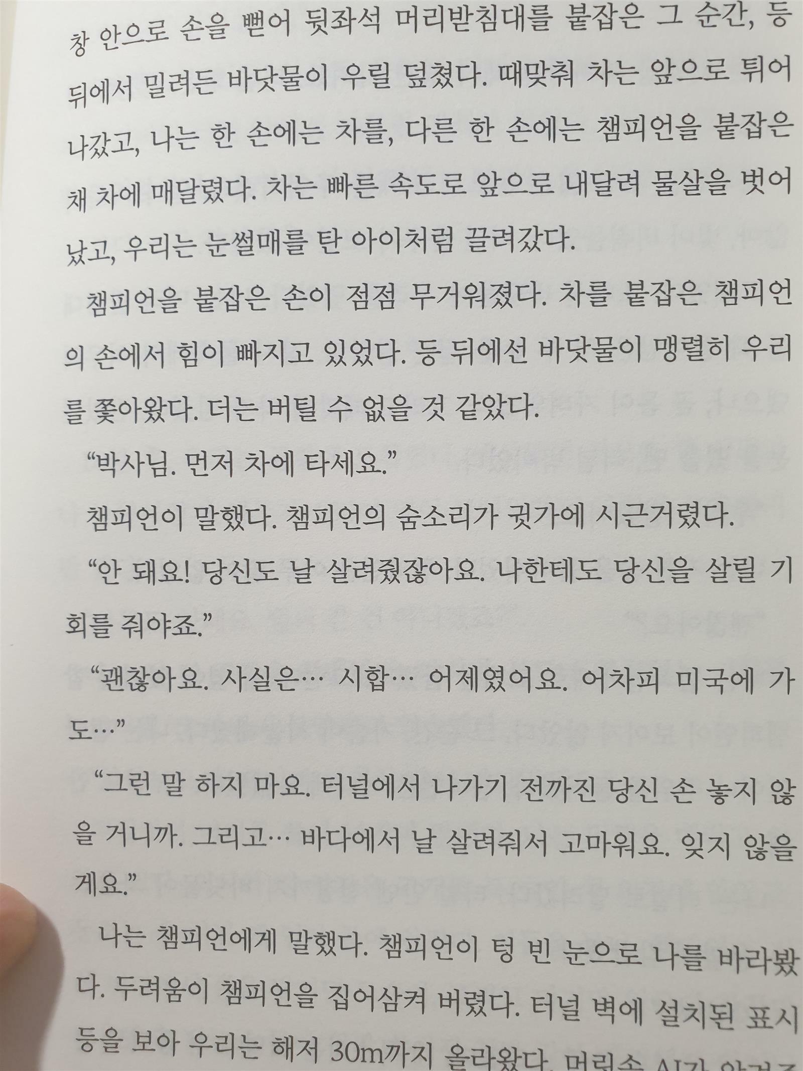 작가는 인간이란 위기 상황에서 각자의 안위만을 생각하는 이기심을 보이는 존재이기도 하며 극한 상황에서 다른 이를 위해 자신을 절체절명의 상황에 던질 수 있는 이타적인 존재임을 알려주는 것 같습니다. 인간은 항상 혼자이길 거부하고 누군가와 연결되어 있거나 함께 할 수 있는 일행, 동맹 등을 만들고 싶어합니다. 극한 상황을 이겨내고 혼자만 살아남아 봤자 황폐해지고 인류가 사라진 도시에서 홀로 된다는 것은 정말 힘겨운 상황이 될 것입니다. 예전에 할리우드 영화 '나는 전설이다'에서 주인공은 다른 생존자를 찾기 위해서 고군분투합니다. 그 과정에서 자신의 곁을 지켜주던 개의 목숨이 끊어지자 너무나 슬퍼하고 괴로워하던 모습이 생각나는군요.