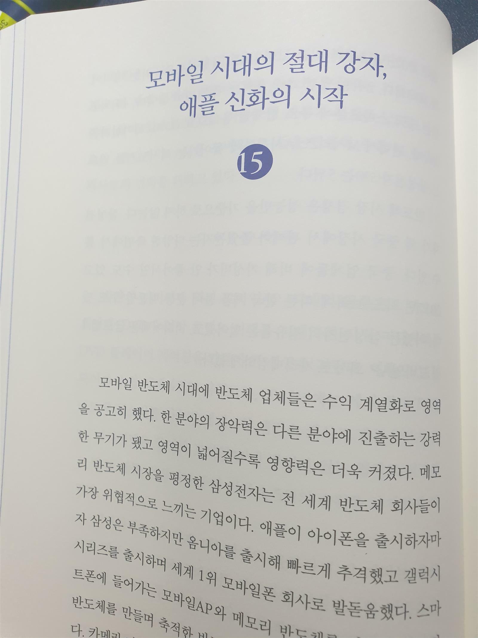 두번째는 반도체 패러다임의 전환이다. 최근 반도체 시장은 모바일 휴대폰의 등장으로 큰 변화를 겪고 있다. 기존의 반도체는 컴퓨터에 가장 많이 쓰이는 부품이었고 개인컴퓨터의 전성시대를 열었던 인텔이 반도체 시장의 강자였다. 그러나 지금의 반도체는 모바일과 데이터 서버 등에 그 쓰임이 더 많아지면서 삼성전자, ARM, 애플, 퀄컴 등이 반도체 시장의 강자가 되었다. 이 책에서는 출판 시기와 맞지 않아 다루고 있지는 않으나 최근 인텔이 반도체 사업부의 일부를 매각하기로 하면서 이제 인텔은 반도체 시장에서 잊혀져 갈 일만 남았다고 볼 수 있다. 하지만 모바일 시장을 이끈 앞의 기업들도 향후 어떤 상황에 놓일지는 아무도 모른다. 최근 반도체의 활용은 모바일을 넘어 온디바이스 AI, 데이터 센터 등 그 영역이 계속 확장하는 중에 있기 때문이다. 최근 엔비디아-SK하이닉스-TSMC의 3개 글로벌 기업이 반도체 동맹을 맺어서 협력한다고 해서 크게 화제가 되었다. 삼성은 구글과 컬컴과 협력을 하는 모양새를 갖추고 있으나 엔비디아 동맹보다는 아직 가시적인 성과를 내고 있지는 못한 것 같다. 엔비디아는 최근 바이오니모라는 신약개발 플랫폼에도 진출하고 심지어 기존이 CPU 시장도 장악해 가고 있다고 하니 그 기세가 엄청나다.