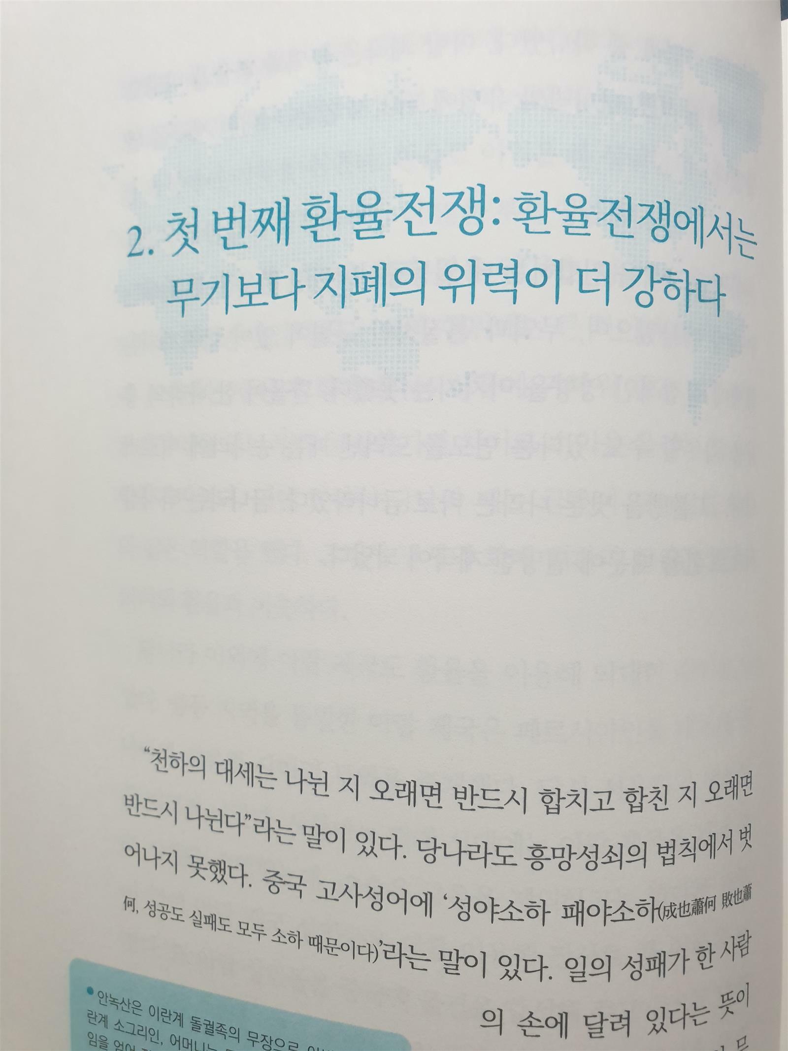 이처럼 환율은 각 경제주체에게 미치는 영향이 매우 큰 것으로 저자는 환율을 경제전쟁의 중요한 요소로 강조하고 있다. 책에서 소개하는 최초의 환율전쟁 사례는 중국 남송 때이다. 남송과의 전쟁에서 승승자구하던 금나라가 지폐 발행을 남발하여 금나라는 큰 인플레이션을 겪게 된다. 금나라 백성들은 화폐가치가 하루가 다르게 하락하자 금나라를 피해 남송으로 이주를 많이 했고 이것이 금나라와 남송 사이의 환율전쟁의 단초가 된다.
