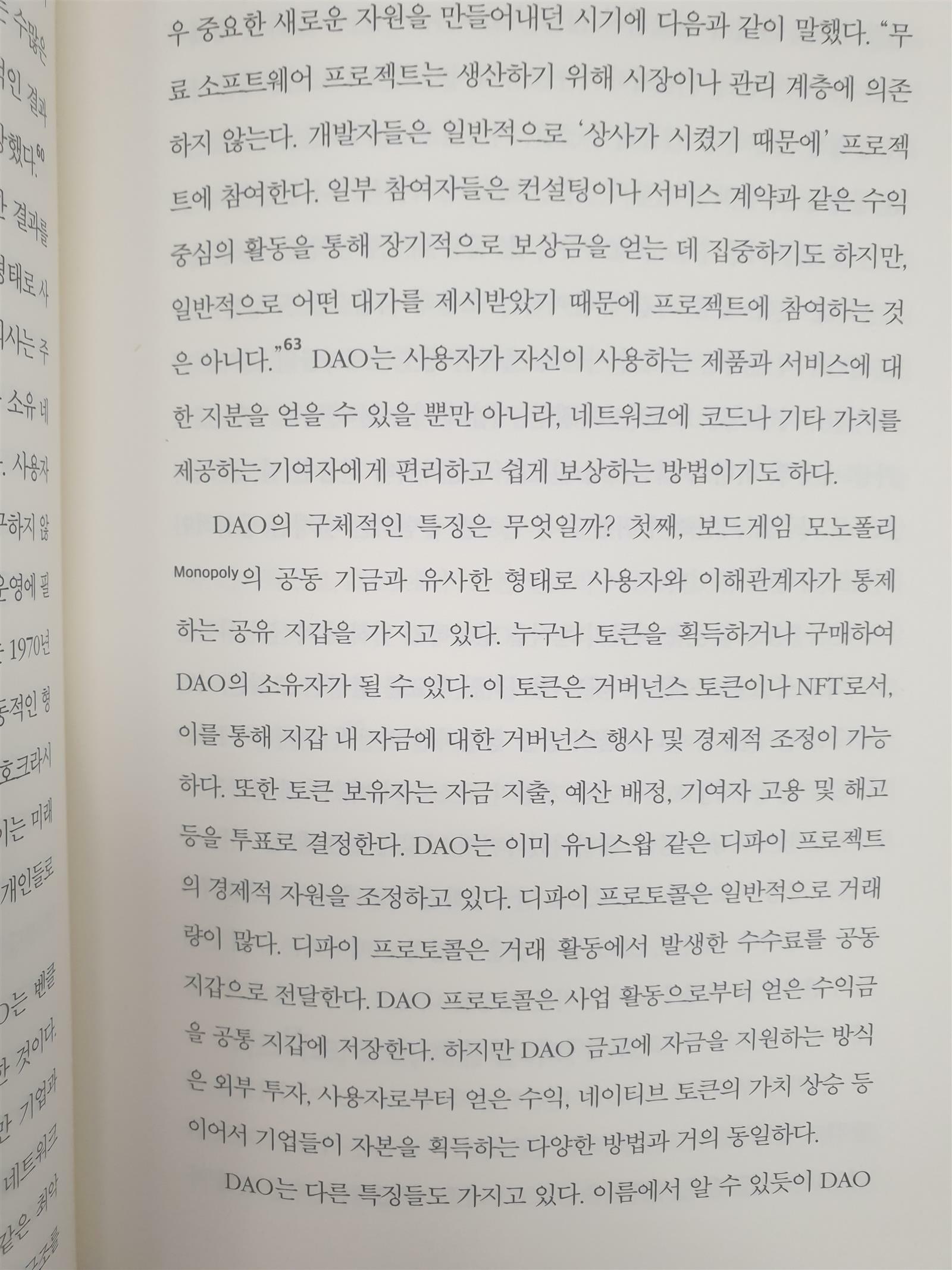 이런 재산권의 소유와 관리를 위해 웹3에서는 탈중앙화 자율조직(DAO)이 필요하다. 소수의 그룹, 일부 사람들만 정보를 소유ㆍ공유하는 중앙집권적 조직과는 달리 DAO에서는 계층구조에 따른 사람의 개입이나 의사결정 없이 오직 규칙과 구성원들의 투표로만 운영되는 조직을 말한다. 앞에서 말한 토큰에 의해 투표권이 주어지지만 익명에 의한 투표로 운영된다. 저자는 이 DAO 조직이 현대의 비즈니스를 변화시키고 혁신시키며 부를 창출하는 모델을 만들고 있다고 한다.