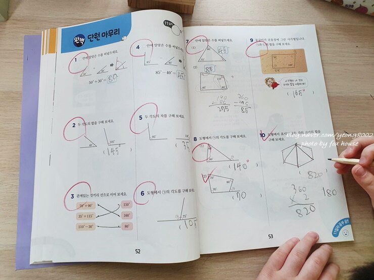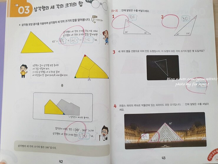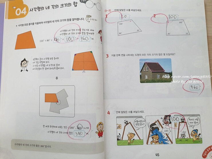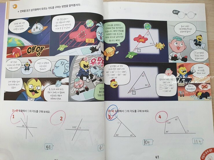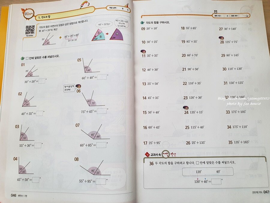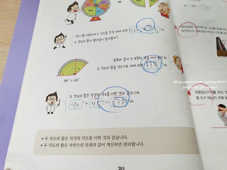 4학년쯤 되면 자연수의 덧셈정도는 기본으로 다 할 줄 아니까 각도의 합도 크게 어렵지 않다.