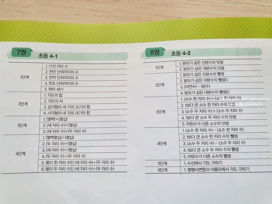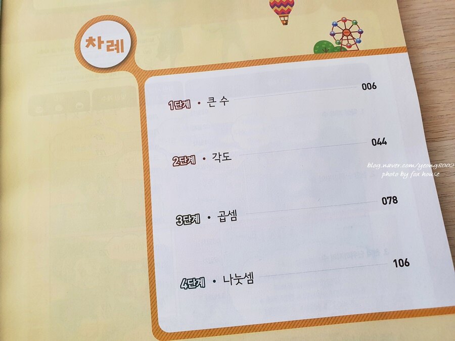 초등 4학년 1학기 과정은 크게 큰수, 각도, 곱셈과나눗셈으로 되어 있으며
