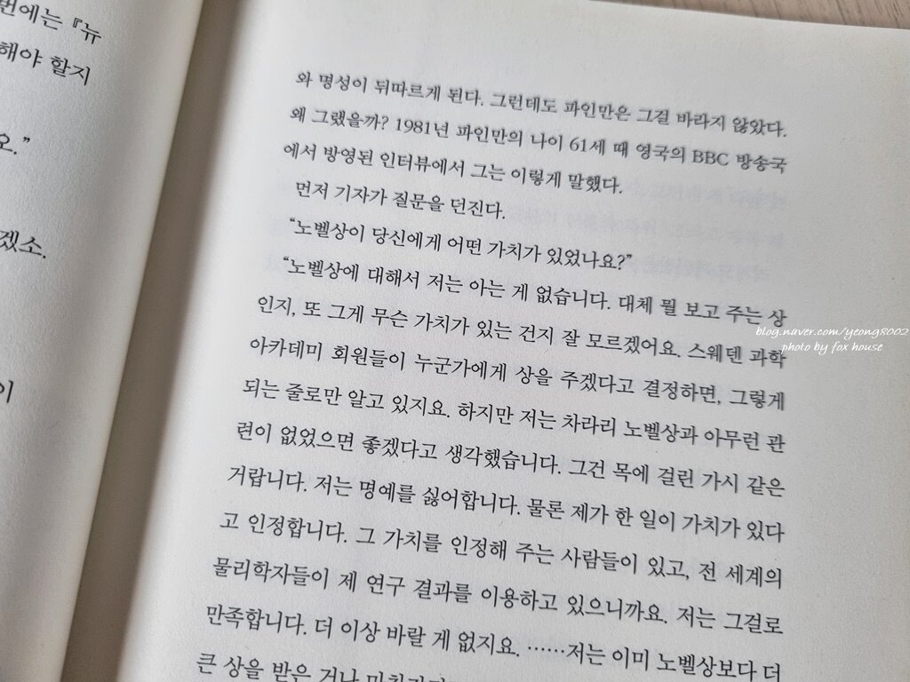 이처럼 노벨상을 받게 되면 따르는 큰 영예와 명성 모두 파인만은 바라지 않았다. 그는 뛰어난 과학자이자 꾸미지 않고 거짓이 없는 솔직함과 자유로운 성품으로 지금까지 학생들로부터 존경받는 교수였다. 과학에 대한 순수한 열정과 열린 사고 방식은 권위를 부정하고 아들이 과학자로 성장하기 원했던 그의 아버지 영향이 매우 컸다. 아버지의 교육철학이 천재 물리학자 리처드 파인만을 있게 했다고 말해도 과언이 아닐만큼... 누구나 영광으로 여길법한 노벨상 수상을 거부하려 했다는 점만 봐도 그는 확실히 남다른 인물이었다. 과학자로서 새로운 것을 발견해 냈을 때 느끼는 기쁨이 최고의 상이자 명예라 생각했던 그야말로 진짜 과학자라고 느껴졌다.
