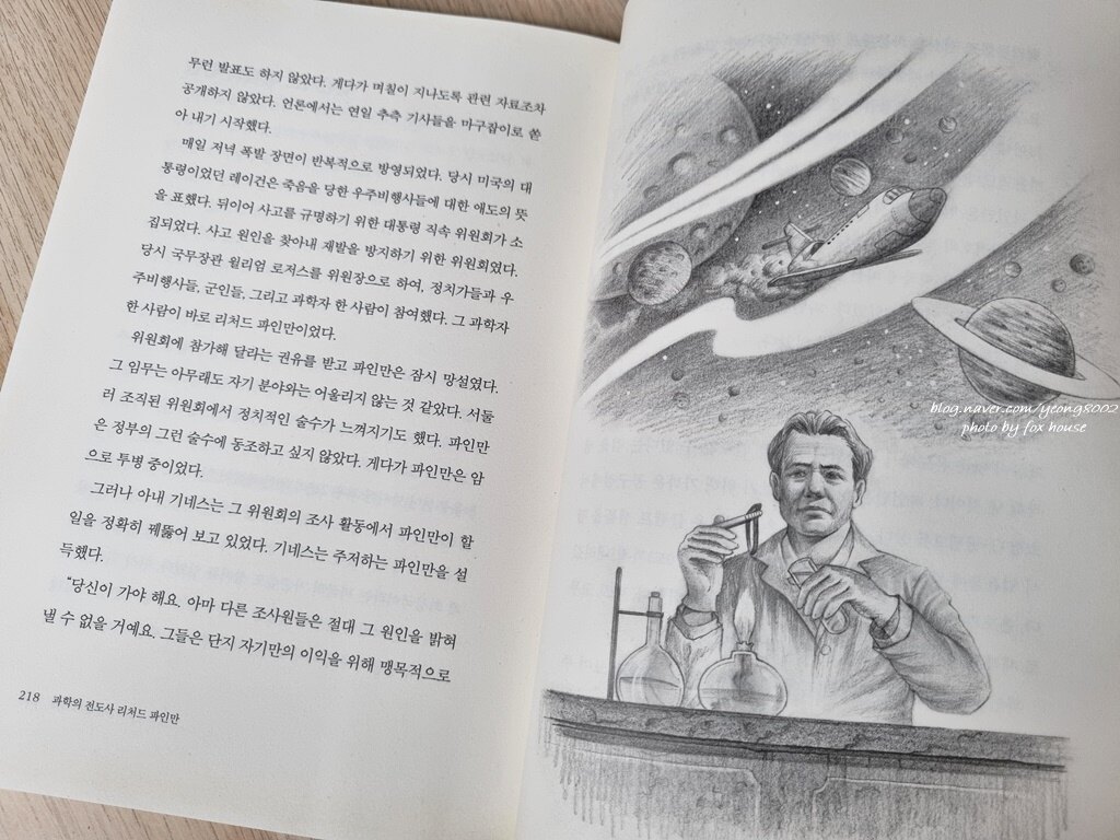 리처드 파인만의 마지막 업적은 우주왕복선 챌린저호 참사의 원인을 밝혀내는 거였다. 다른 조사원들이 자기만의 이익을 위해 달려들때 파인만은 차분하게 뭔가를 찾아낼 수 있을 거라는 아내의 말처럼 실험을 통해 원인을 밝혀냈다. 파인만이기에 숨김없이 시원하게 밝혀낸 것이다. 이 일로 다시 한번 천재 물리학자 파인만의 이름이 세상에 알려졌다.