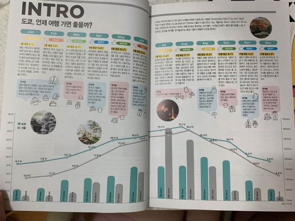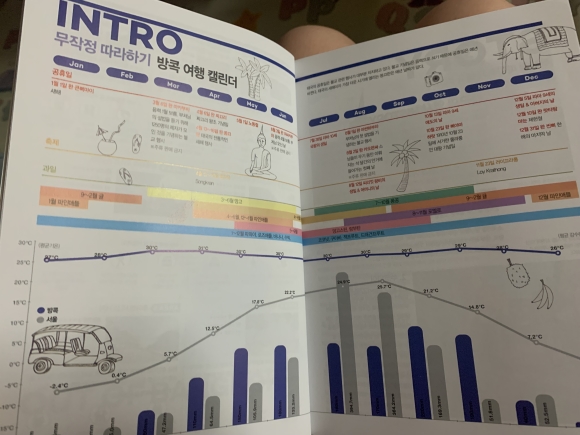 방콕 여행 캘린더로 월별 날씨와 공휴일, 축제 및 과일도 소개해 주었어요. 철마다 맛있는 과일이 눈에 들어왔구요. 서울 날씨와 비교해보면 정말 한여름 날씨가 1년 내내 이어지네요. 그나마 30도 이하인 11월-3월에 여행가는 걸 추천한다고 해요.