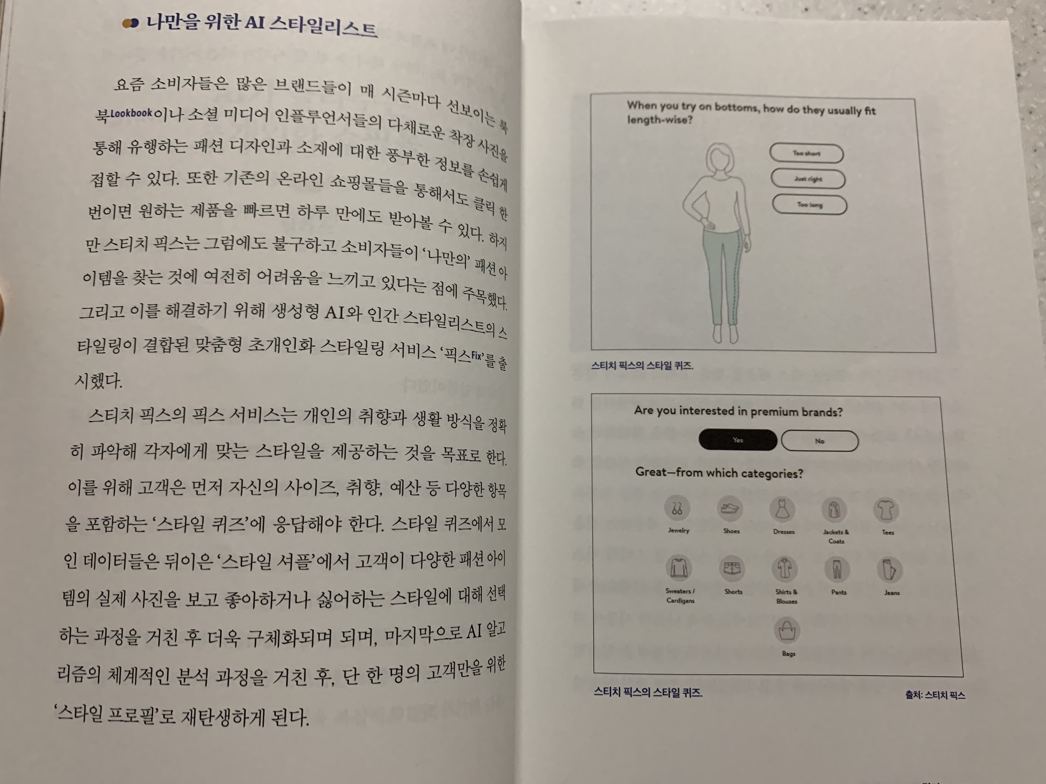 그리고 매 계절마다 옷을 고르는 것은 쉽지가 않다. 유행에 뒤쳐지지는 않으면서 나만의 취향을 고수하고 싶은 마음도 옷으로 표현하고 싶다. 하지만 쇼핑을 하는 시간도 넉넉치가 않다. 오죽하면 스티브잡스는 쇼핑하는 시간도 아까워 똑같은 옷만 입었다. 우리는 가끔 쇼핑을 할 때마다 옷장을 열때마다 “아~ 누가 내 대신 내 맘에 쏙 들게 옷 좀 착 골라줬으면 좋겠다~!”하는 생각을 누구나 한 번 쯤은 했을 것이다. 그 고민을 해결하주는 맞춤형 AI 가 나타났다. 달라스의 “스티치 픽스” 라는 AI 는 나만의 체형, 취향, 예산 등 다양한 항목을 포함하는 ‘스타일 퀴즈’ 에 응답하여 고객이 다양한 패션 아이템의 실제 사진을 보고 좋고 싫음을 선택하는 과정을 거친 후 더욱 구체화되며 AI 알고리즘의 체계적인 분석을 거친 후, 단 한 명의 고객만을 위한 ‘스타일 프로필’ 을 사용자에게 소개한다. 소개된 스타일대로 골라 준 옷이 맘에 들면 그대로 구매도 가능하여 배송까지 받을 수 있다. 구매결과는 데이터로 축적되어, 더욱 디테일하고 섬세한 나만의 스타일 데이터가 된다.