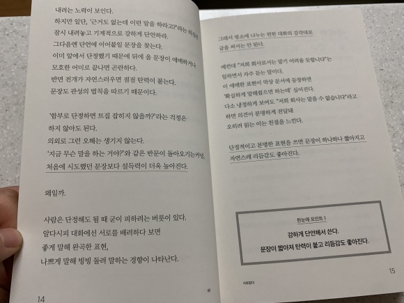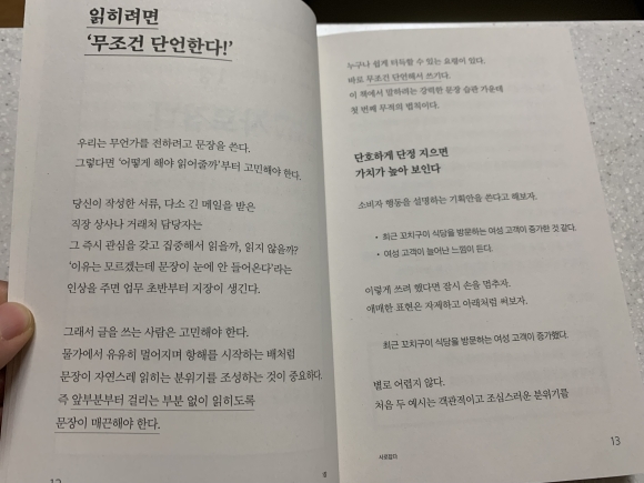 독자가 중요하게 읽었으면 하는 부분은 밑줄을 긋거나 크고 굵은 글씨로 표시해두었으며, 비교예시가 필요한 글은 색을 다르게 해서 박스형태로 구분하여 명확히 구분하여 알려주고 있다. 두루뭉술한 문장과 생동감있는 문장으로 우리의 실수를 고쳐주는 듯하다.