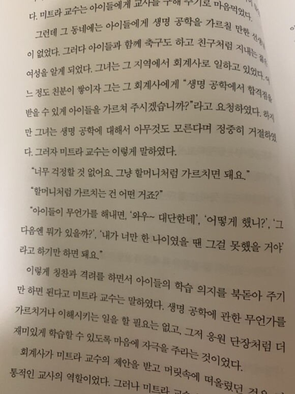 또 다른 실험 하나는 그 아이들에게 생명공학을 가르칠만한 선생님을 찾는 것으로 시작한다. 그 지역에서 아이들과 친하게 지내는 회계사에게 부탁을 했으나 처음엔 거절을 했으나, 생명공학에 대한 지식을 가르치는 것이 아니라 " 할머니처럼 가르치면 돼요." 라고 요구한다. 그것은 할머니처럼 잘하면 칭찬하고, 못하면 격려하고 응원해주는 역할만 하는 것이었다. 그렇게 두 달이 지나니, 아이들은 처음보다 더욱 높은 교육의 결과를 얻게 되었다.