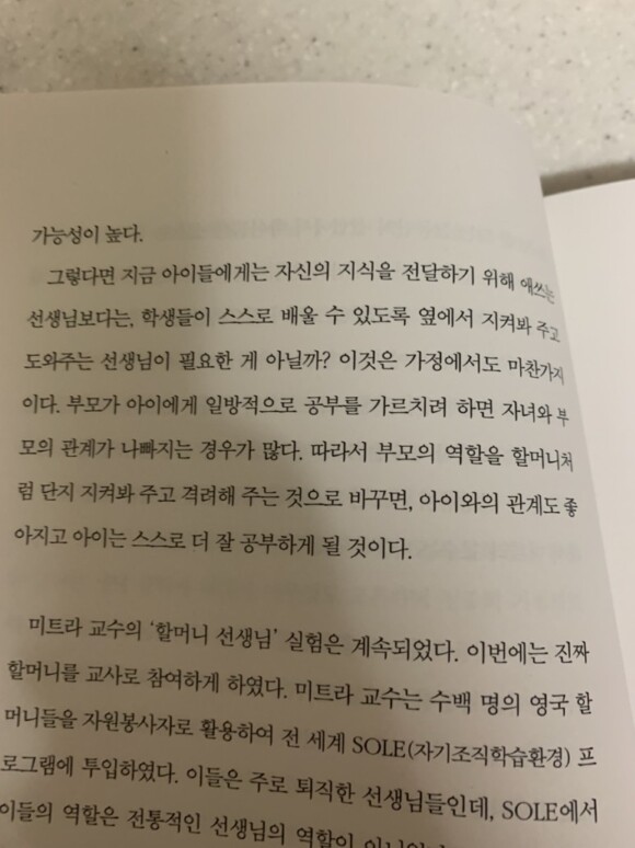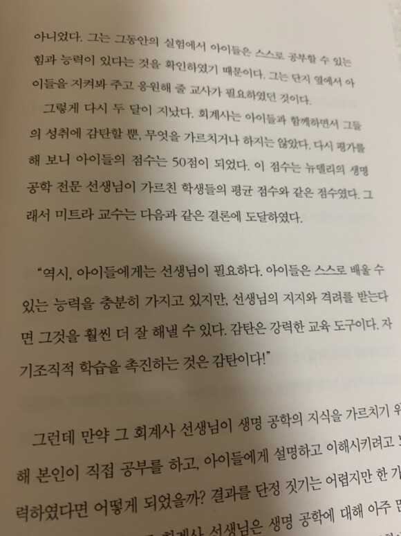 이 부분을 읽으면서 예전에 자기주도학습에 대한 알바를 잠깐 했던 것이 생각났다. 자기주도학습 교사는 공부는 실제적으로는 가르치지 않는다. 다만, 지금의 현재 위치에서 얼마나 알고 있는지, 한 주 동안 얼마 만큼의 공부의 양을 했는지, 그리고 공부한 노력에 대해서 칭찬해주고, 부족한 부분에 대해서는 격려해주고, 문제집이나 또 다른 참고할 것들을 안내해 주는 역할만 했다. 그것만으로도 아이들은 자신이 스스로 공부할 방향을 찾아가고, 스스로가 공부를 하고, 자기의 위치를 알고, 자기의 역량을 알아가며 공부의 수준을 쌓아가고 있는 것들을 엿볼 수 있었다.
