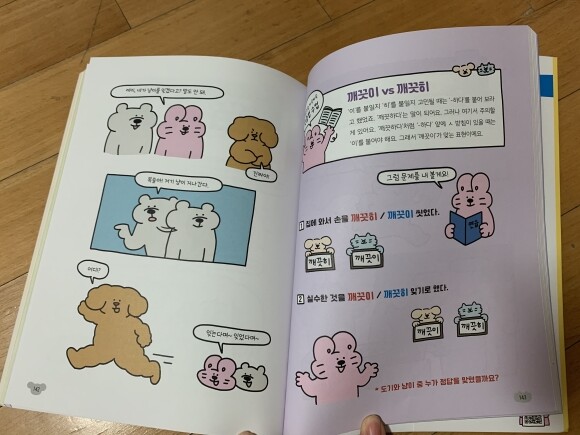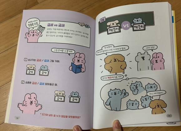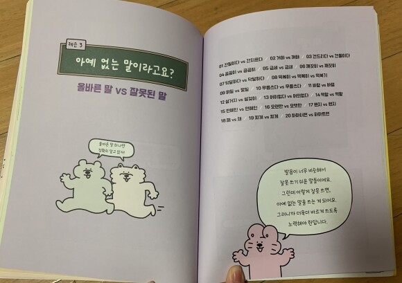 핑크색 김토끼가 친절하게 재밌게 맞춤법을 가르쳐주고 있어요. 아이들이 흥미를 가질 수 있을만한 그림이에요.