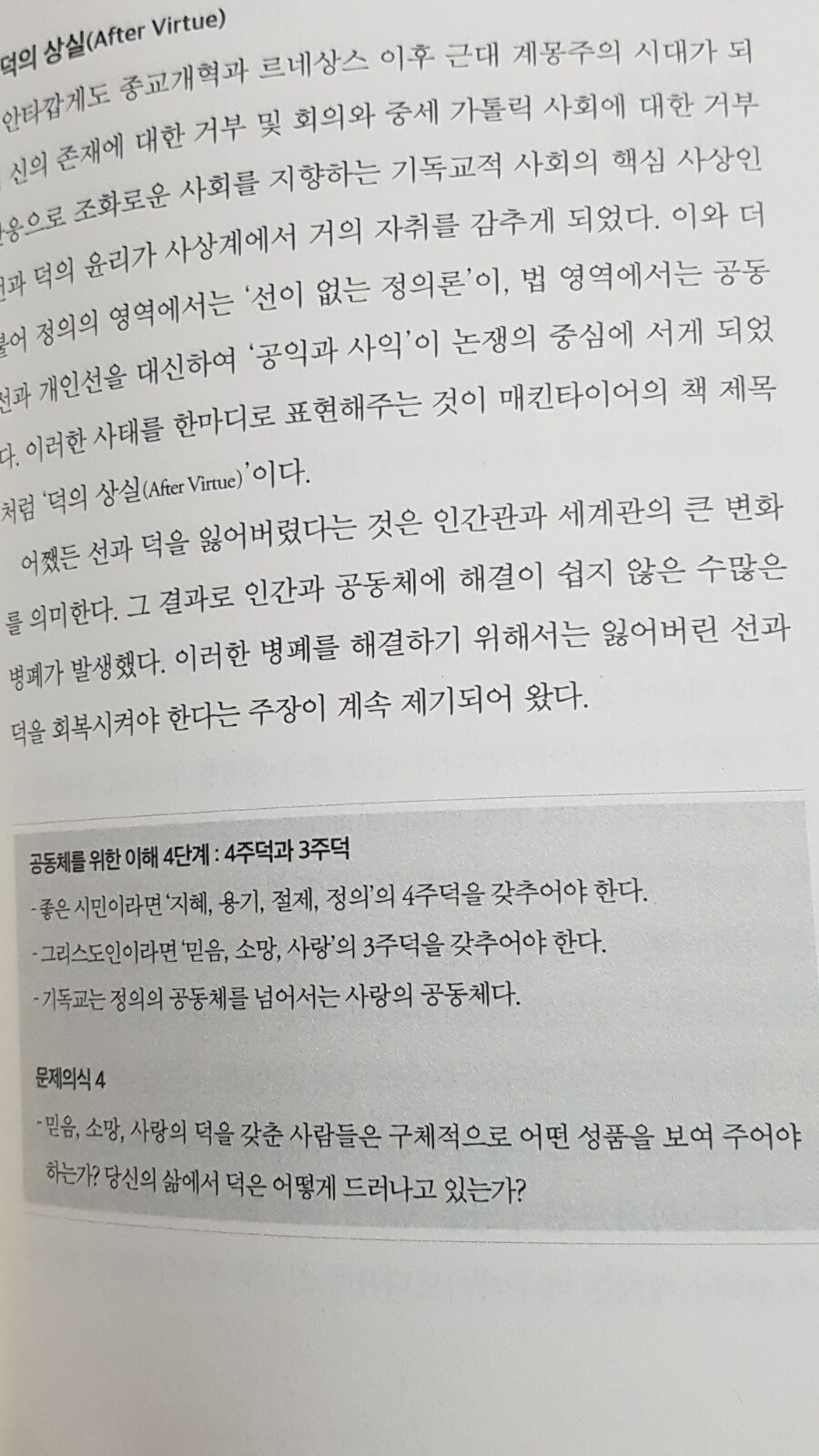 저자는 왜 정의가 사라지고 선이 사라졌는지,그 원을 신에 대한 가치훼손으로 보고 있다.우리가 생각하는 신이란 최고의 선, 절대적인 선으로 인식하고 있다.그리고 21세기 들어서서 우리는 신의 역할은 축소되었으며, 과학의 힘은 점점 더 세져가고 있었다.바로 이 책은 그런 우리의 일상적인 모습을 보고 있었으며, 왜 우리는 정의와 선에 대해서 강조하는 지 한 번더 생각하게 된다.