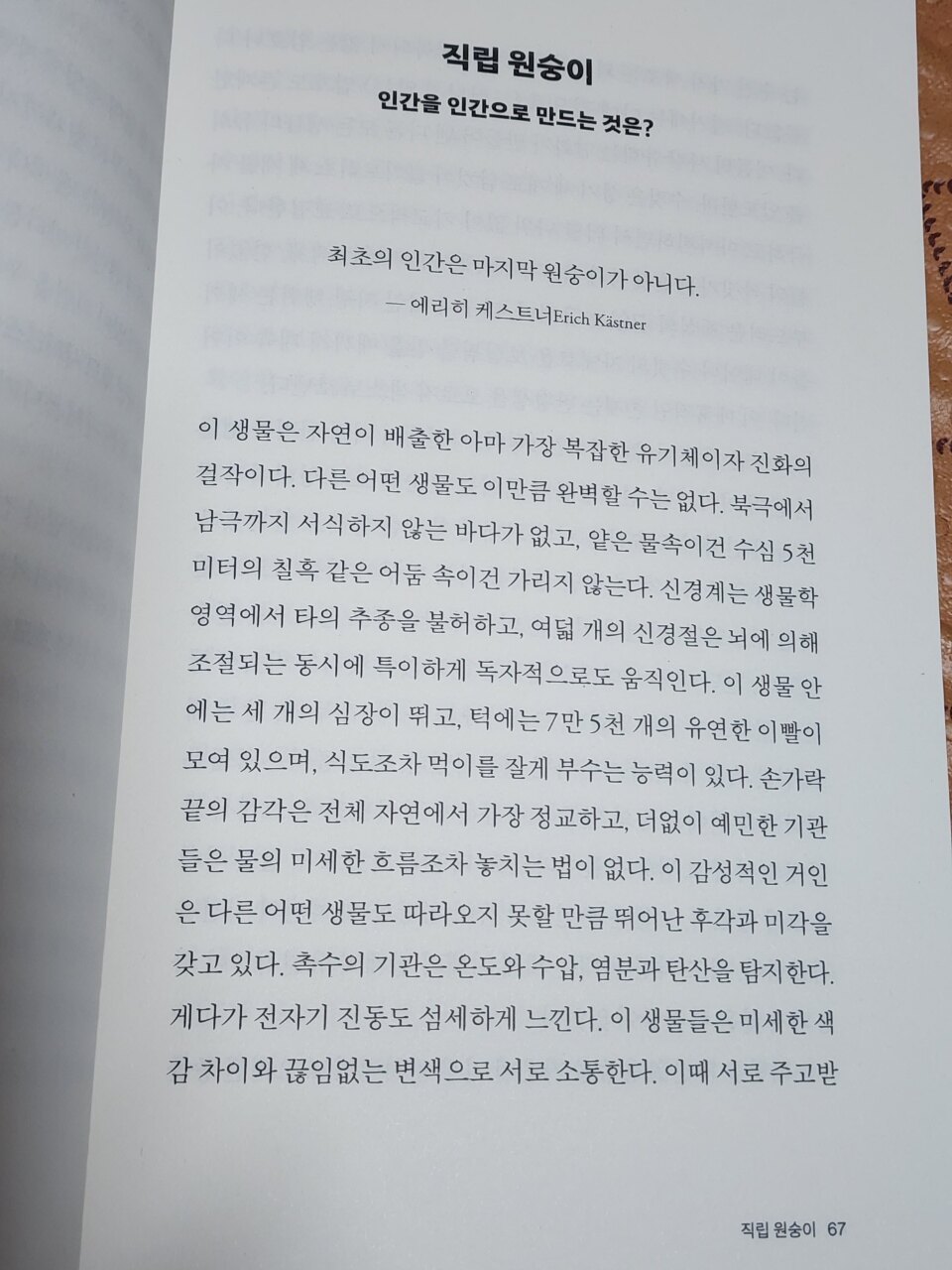 그런데 신피질에 이름 그대로 새로운 것이 아니라면 뇌 용량의 급속한 확대는 분명 주목할 만한 발달이다. 네덜란드 의사 루이 볼크는 1920년대에 이미 그에 대해 정교한 설명을 내놓았다. 그는 원숭이와 인간 태아 사이의 차이가 미미하다는 사실을 확인했다. 다만 원숭이와 달리 인간 태아는 더 천천히 발달하고 , 태아 단계에서 가령 두개돌의 균형이나 털 없는 상태 같은 몇가지 결정적인 상태를 유지한다. (-85-)