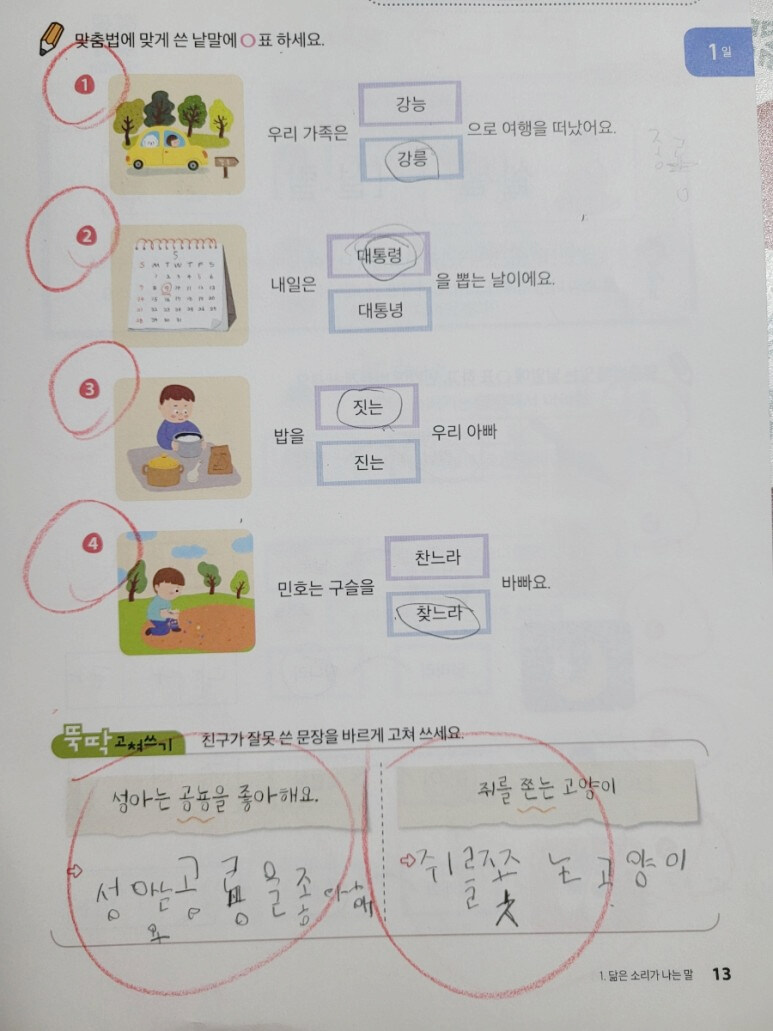 그림과 소리나는 대로 쓴 글씨를 보고 올바른 맞춤법을 스스로 써 보아요.