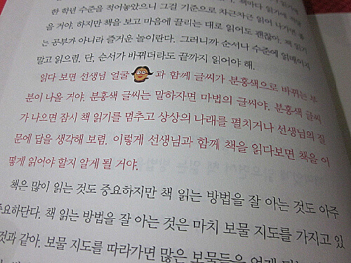 분홍색 글씨가 나오는 부분은 잠시 책읽기를 멈추고 생각해보거나 마음대로 상상해보는 시간을 갖게 합니다.