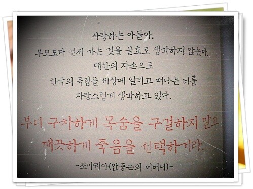 역시 훌륭한 어머니가 있었기에 안중근의사와 같은 위대한 인물이 있을 수 있는 것이다. 안중근의 어머니는 아들의 사형이 확정되자 수의를 보내며 안중근에게 위와같이 말했다고 한다. 아들을 사랑하는 마음이 없어서 그랬겠는가? 정말 눈물겨운 대목이 아닐 수 없다. 조마리아 여사는 안중근 가문과 독립운동가들에게 상징적 어머니 였으며 정신적 지주였다고 한다. 일본 순사와 헌병들은 안중근의 죽음앞에서도 의연한 태도에 깊은 감명을 받아 그를 존경하고 있었는데, 조마리아 여사를 본 순간 이렇게 말했다고 한다.