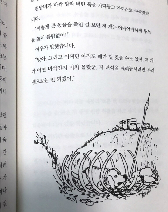 저렇게 큰 동물을 죽인 걸 보면 저 개는 어마어마하게 무서운 놈이 틀림없어!