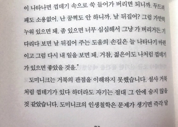 기다리다 보면 날 뒤집어 주는 도움의 손길은 늘 나타나기 마련이고 그럼 다시 내 일을 보면 돼. 거참, 젊은이도 나처럼 껍데기가 있으면 좋았을 것을.