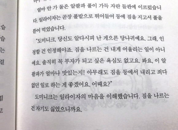 솔직히 꼭 부자가 되고 싶은 욕심도 없고요. 봐요, 이 알팔파가 얼마나 맛있는지! 아무래도 짐을 등에서 내리고 죄다 없던 일로 하는 게 좋겠어요. 어때요?