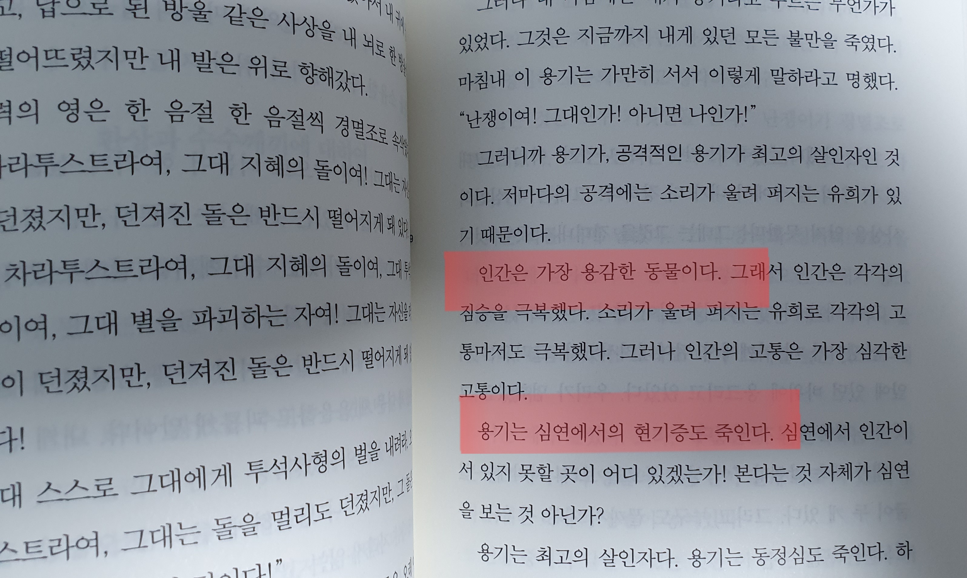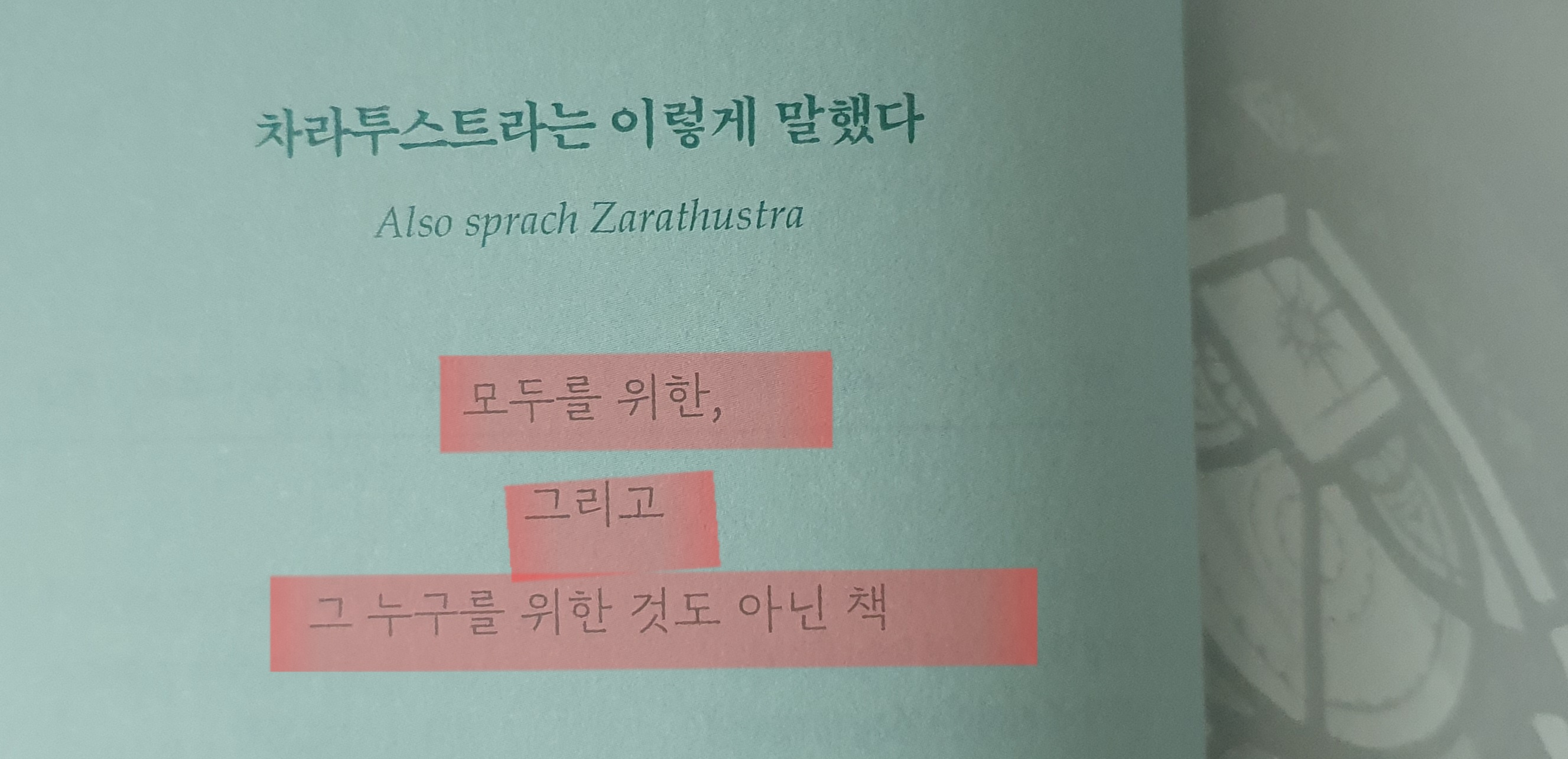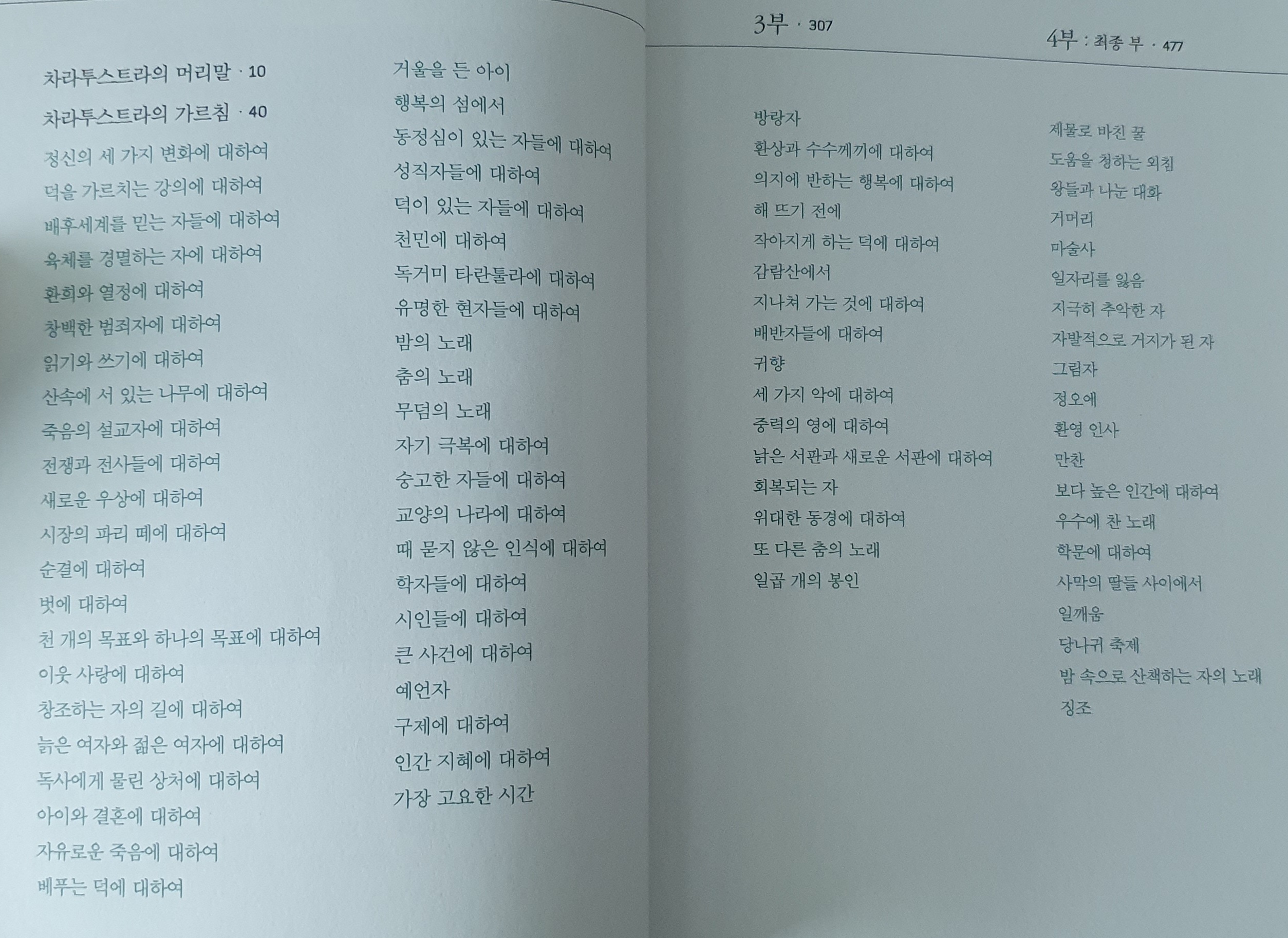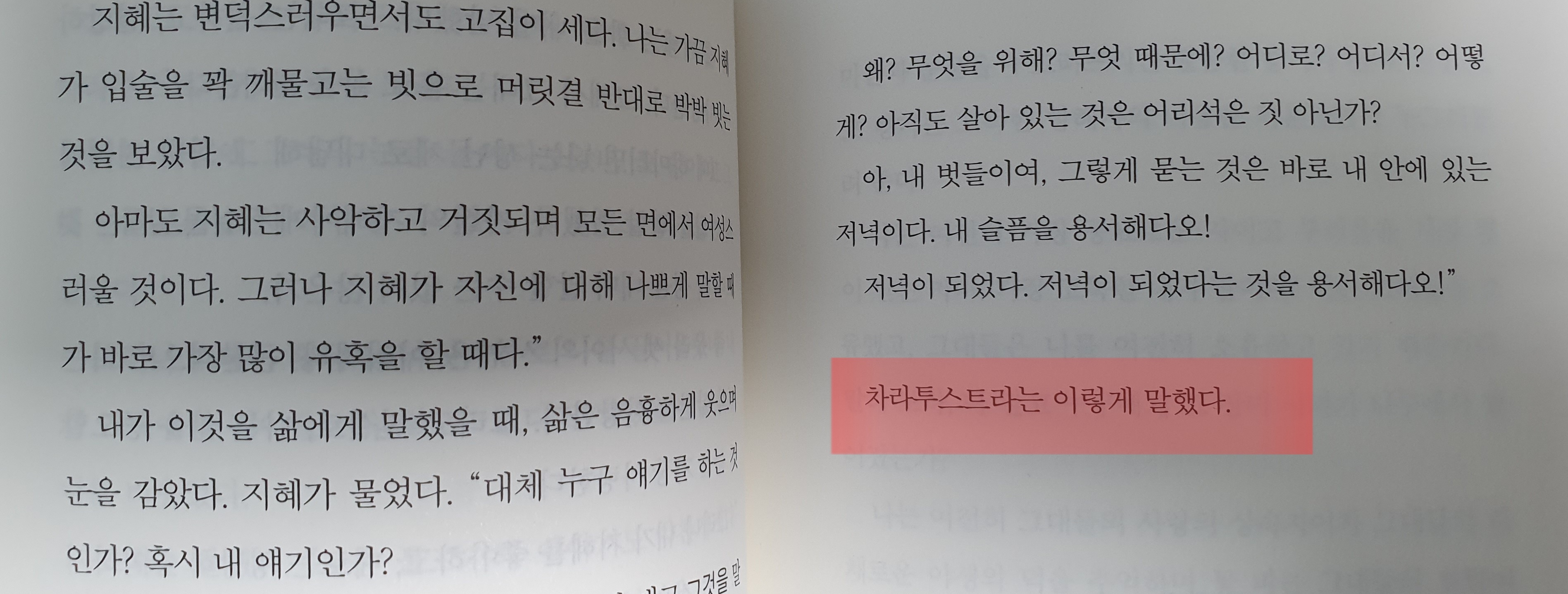 한 부분의 끝에 나오는 '차라투스트라는 이렇게 말했다'라는 것을 보면 제가 지금 종교 경전을 보고 있는 건가 하는 생각이 들었습니다. 어떤 큰 깨달음을 얻은 성인(聖人)이 우리 같은 범인(凡人)에게 가르침을 주고 있다는 인상을 깊게 받습니다.