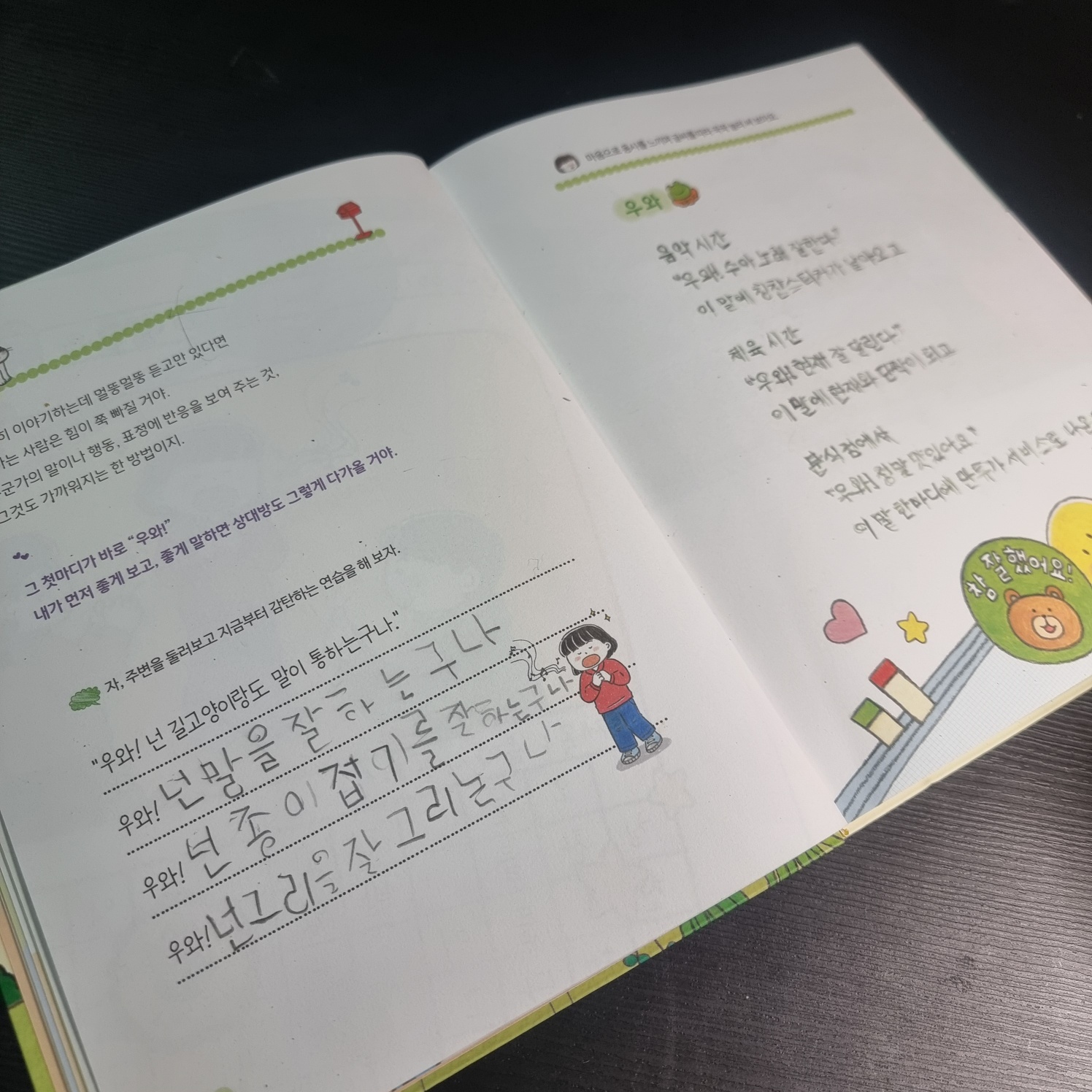 초등 저학년에 동시를 읽으면 어떤 표현인지에 대한 질문이 많았어요. 초등 2학년이 되면서 다양한 책을 읽으면서 동시를 꾸준히 읽어보는 것이 좋겠다는 생각이 들었어요. <이토록 순수한 마음 동시, 동시 따라 쓰기>에 있는 동시들이 너무 재미있었어요. 재미있는 동시를 실감나게 읽으며 다양한 표현들을 배울수 있었어요.일상에서 가까이 경험할 수 있는 일과 재미있는 제목과 동시를 읽으며 까르르 웃는 아이였는데요. 동시를 읽으며 아이의 생각을 적어보고 동시를 따라 적어보면서 동시의 재미를 더 깊이 느껴볼 수 있었어요. 하루에 하나의 동시를 읽어보고 있는데요. 톡톡튀는 재미있는 동시를 읽는 재미를 느껴볼 수 있어 아이와 활용하기 너무 좋은 책이였어요.