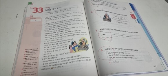 모순이라는 어휘에 대해 알아볼 때 창과 방패를 파는 장사꾼이 하는 말을 읽으며 아무것도 못 뚫는 방패와 무엇이든 뚫는 창을 파는 장사꾼의 말이 너무 이상하다고 해요. 이렇게 글을 읽으며 속담 또는 한자성어 등의 어휘의 의미를 생각해보고 글 속에 여러 어휘들을 알아보니 아이가 더 이해하기 쉽다고 해요.