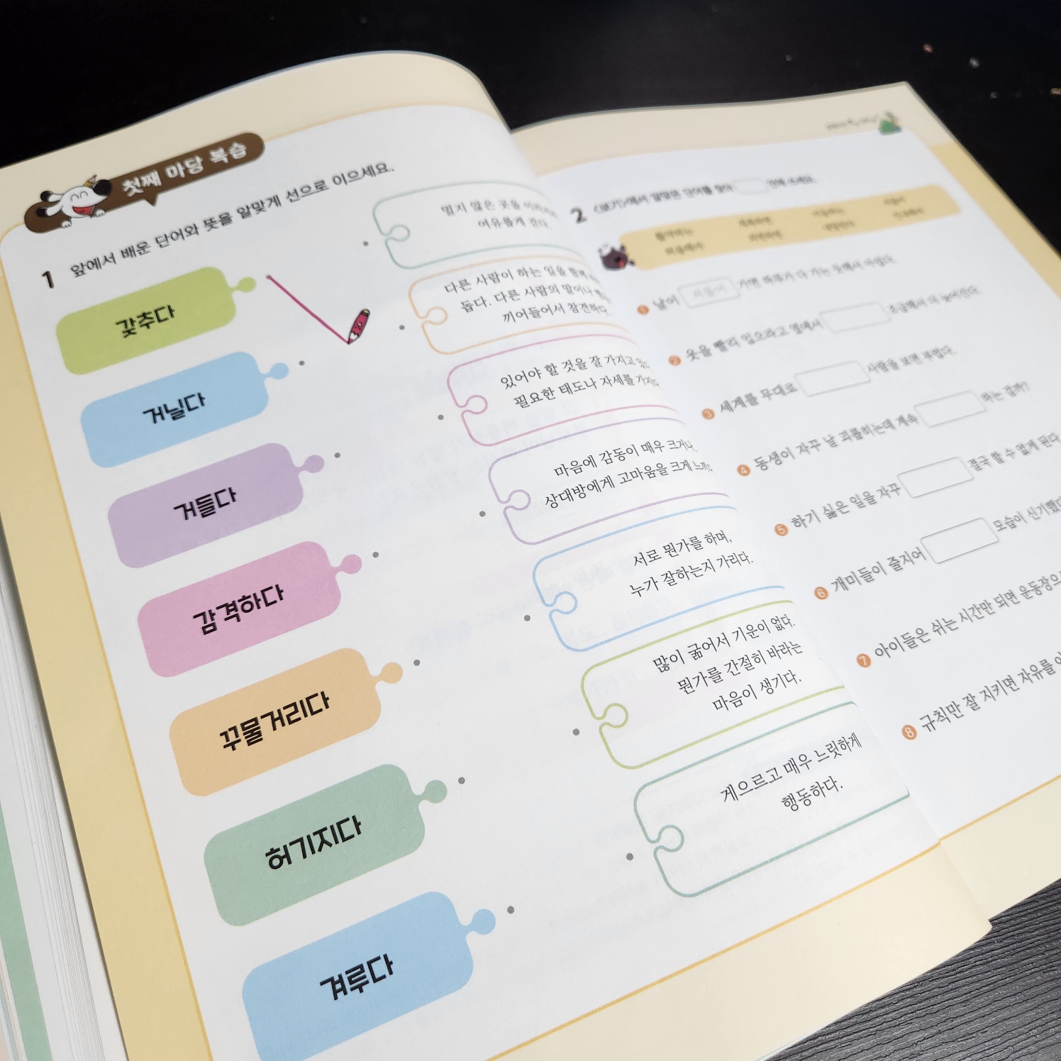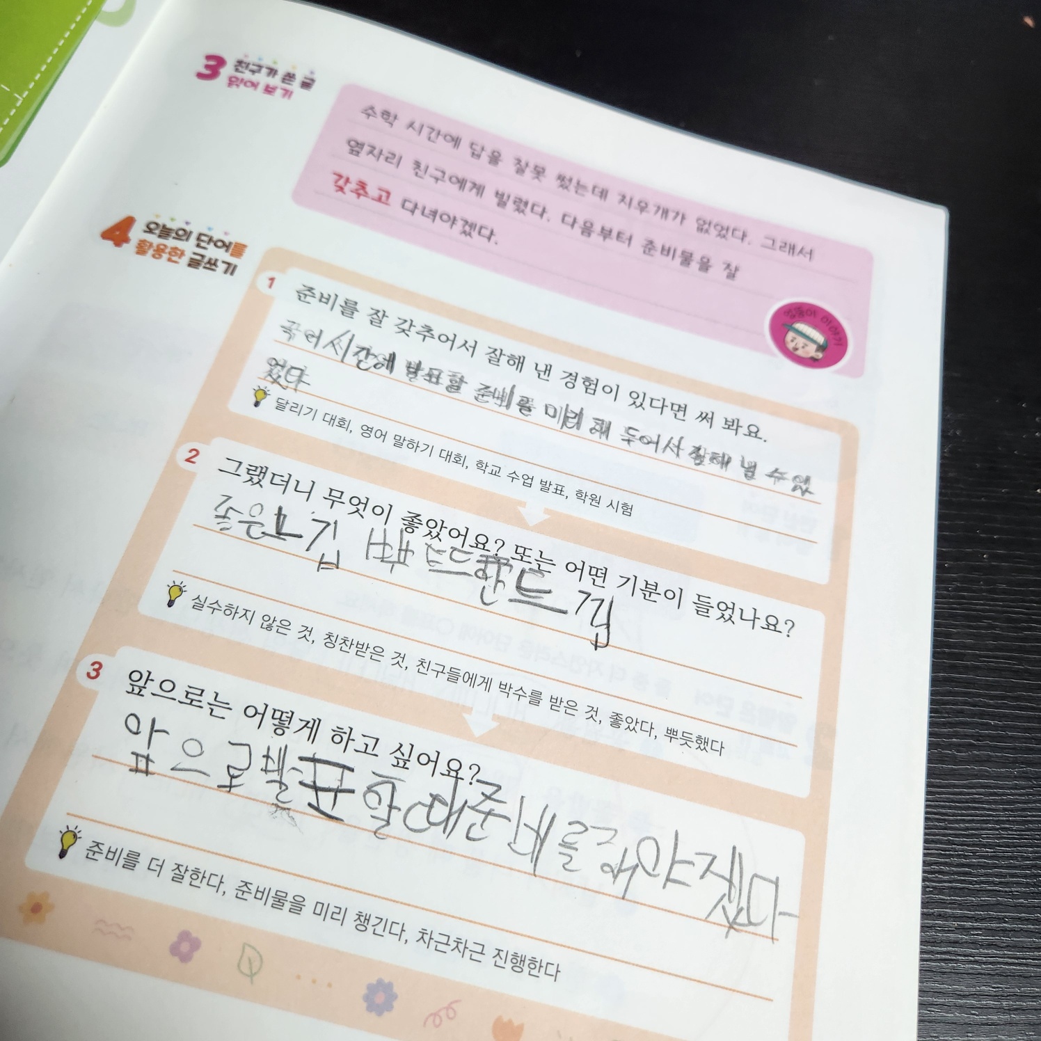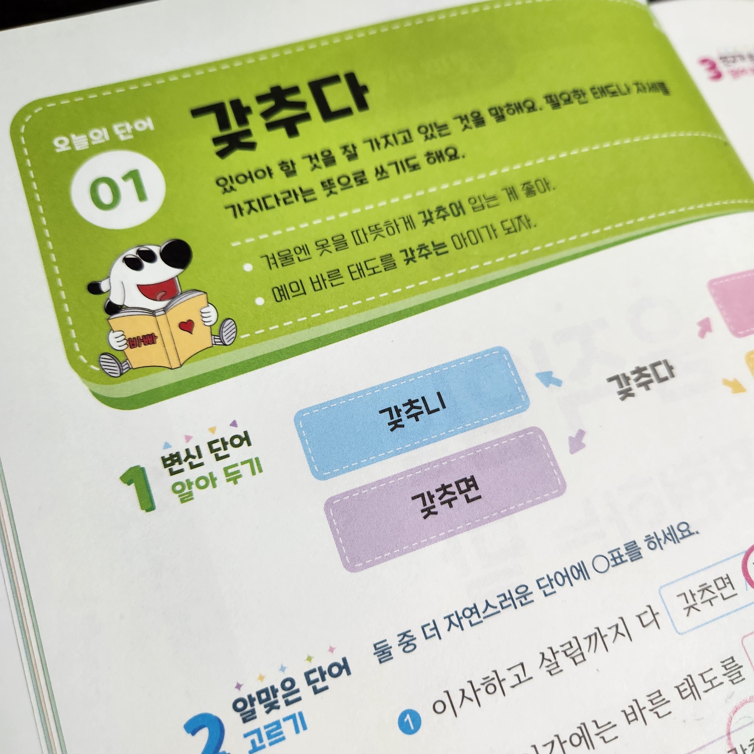 아이와 초등 국어 학습을 할때면 늘 어휘에서 어려워 해요.바빠 초등 문해력 어휘 100은 어휘의 의미를 알아보고 문장속에서 어떻게 활용할 수 있는지 알아갈 수 있었어요.아이가 어렵지 않게 활용할 수 있는 교재여서 아이와 재미있게 어휘학습을 이어가고 있어요.오늘의 단어의 의미를 알아보고 어휘가 문장에서 어떻게 변화게 되는지 알아볼 수 있어 좋았어요. 다양한 표현을 알아보면서 표현하는 방법을 알아갈 수 있었는데요. 이런 부분이 너무 좋았어요.어휘의 의미를 알아보고 난 후 아이가 글쓰기도 해볼 수 있었는데요. 처음엔 어렵다고 말을 하던 아이가 조금씩 천천히 글쓰기를 하는 모습을 보면서 칭찬을 많이 해주었어요. 이렇게 어휘의 의미를 알아보고 문장속에서 표현 방법을 배우고 그것을 표현하는 방법까지 알아갈 수 있는 교재였어요.