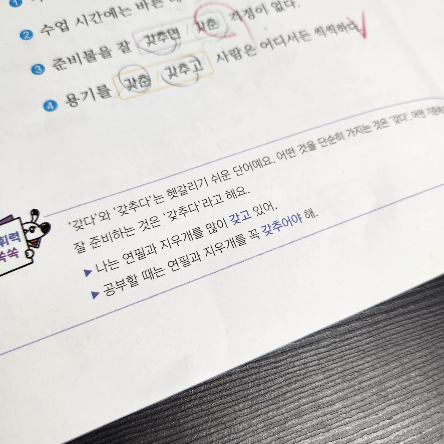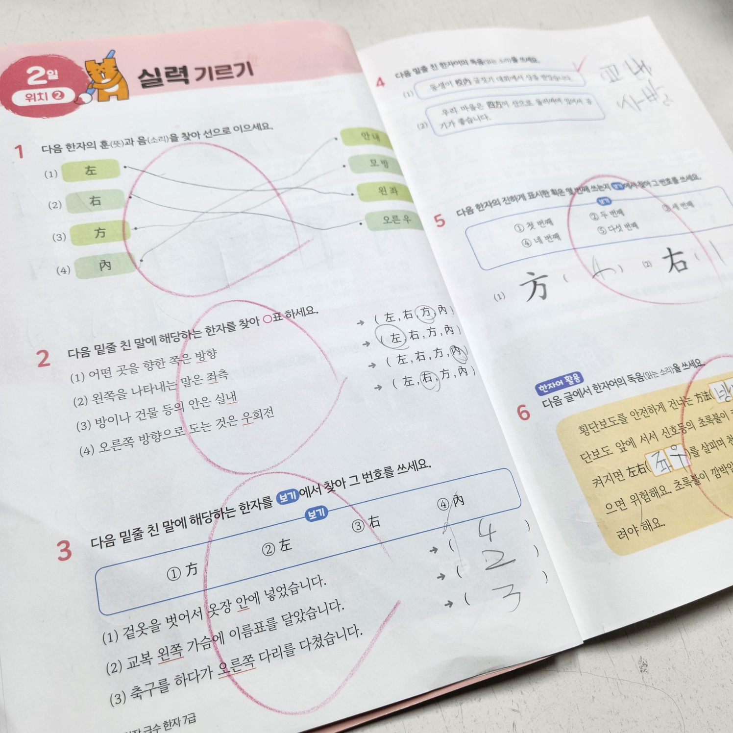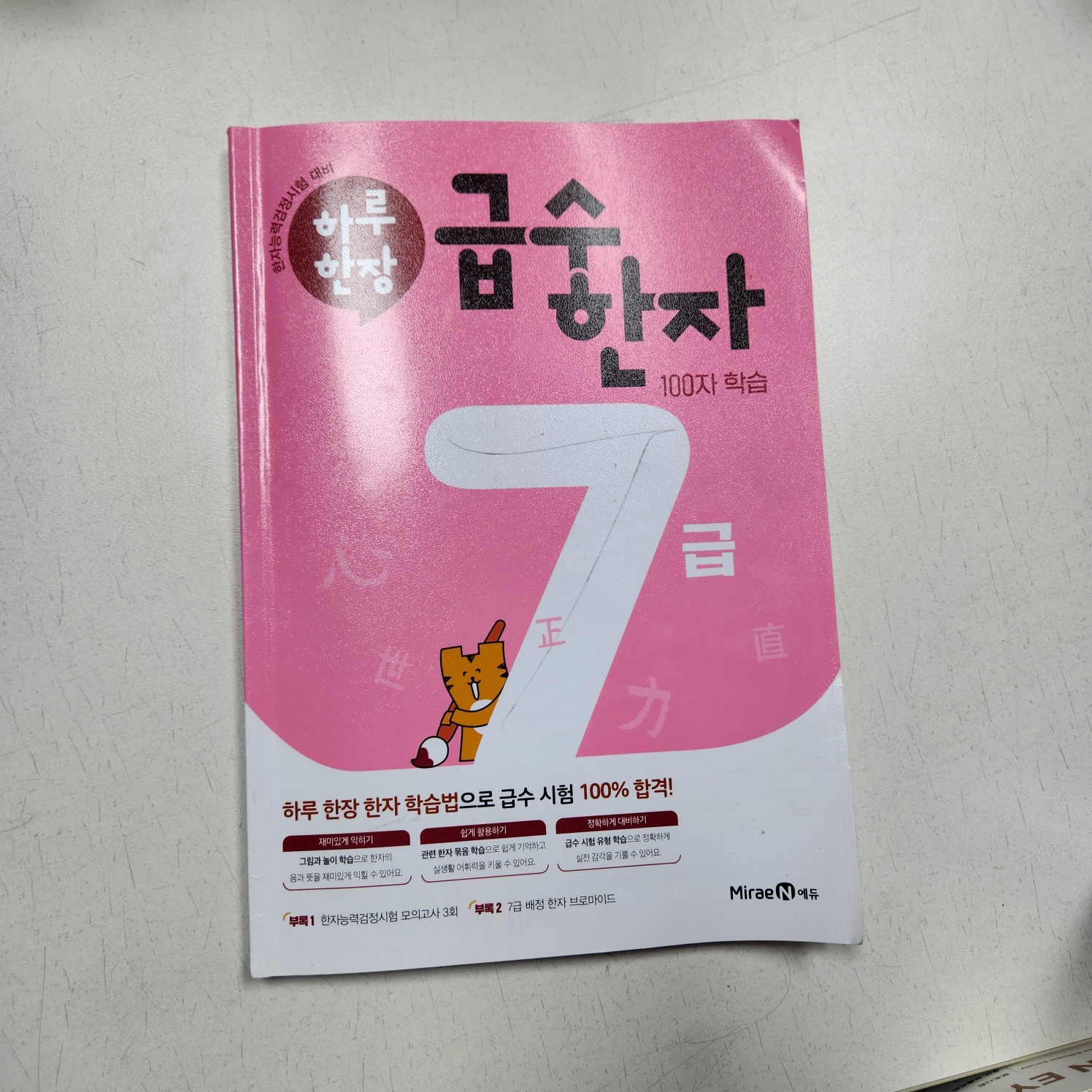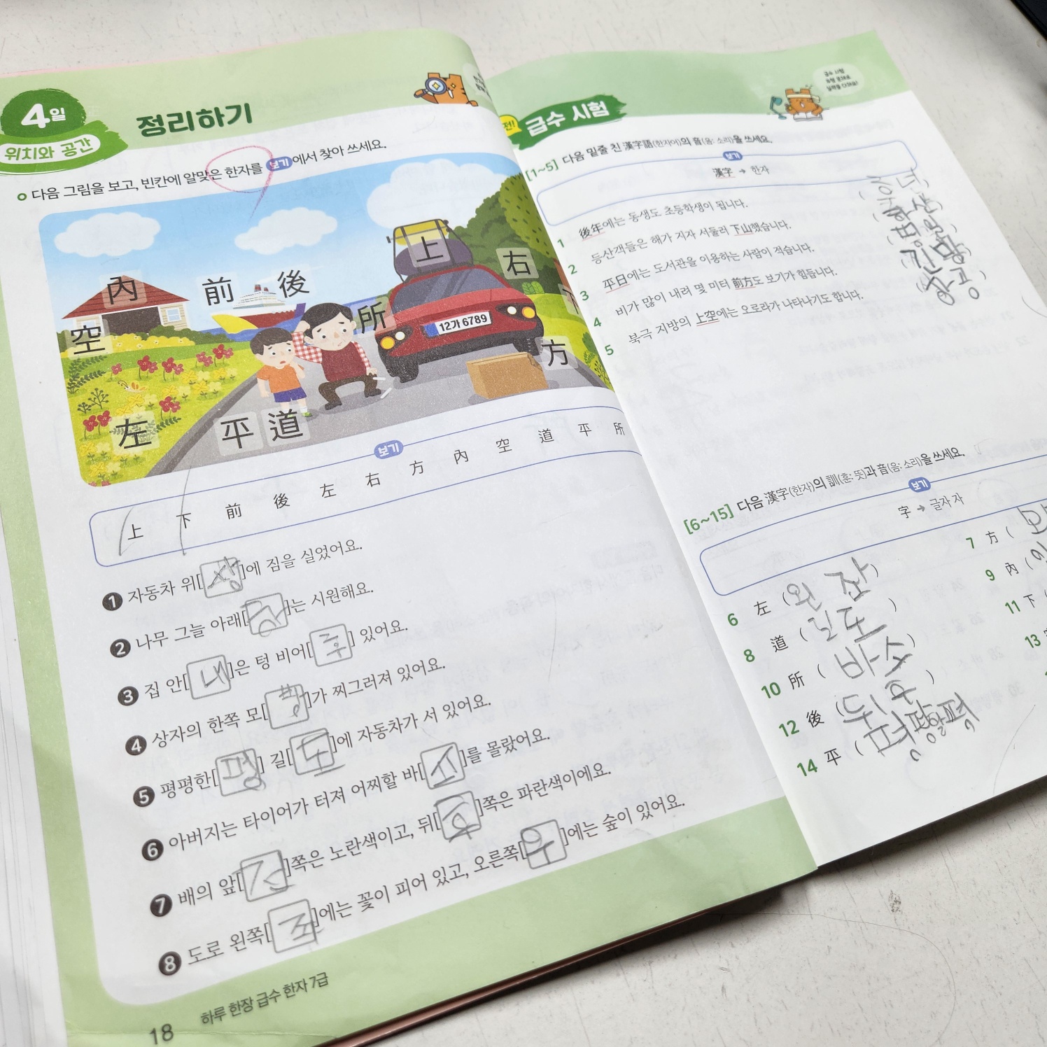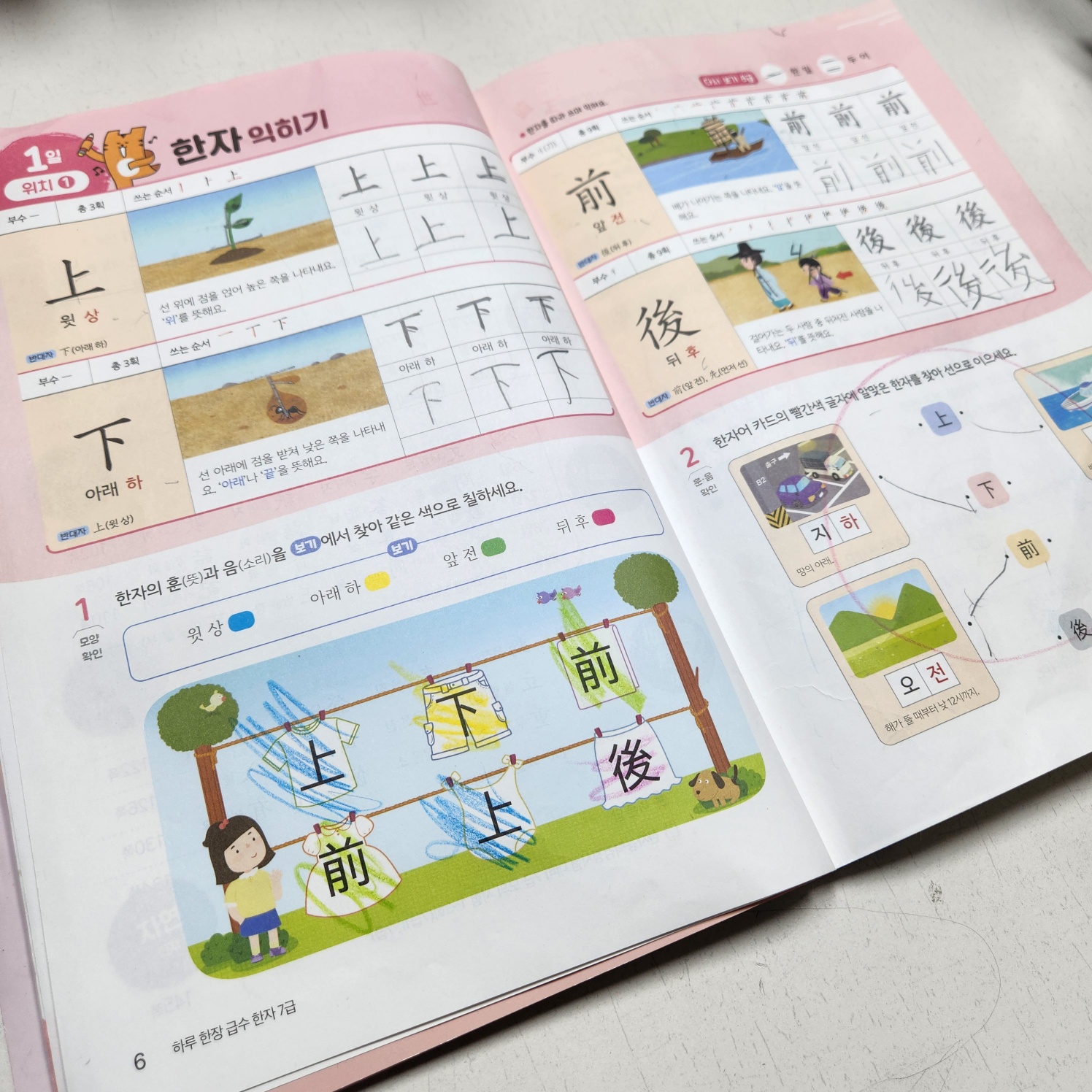8급한자 학습을 모두 마무리 하고 난 후 7급한자 학습을 시작하기 전 어떤 교재로 시작할지 고민을 하다가 '하루한장 급수한자 7급'으로 학습을 하고 한자능력검정시험도 도전해 보면 좋겠다는 생각이 들었어요. 아이에게 물어보니 그렇게 하고 싶다고 말을 해요. 아이와 목표를 정하고 난 후 매일 열심히 한자를 외우고 한저 어휘를 익히고 있어요.아이는 [하루한장 급수 한자 7급]은 한자의 의미를 쉽게 알아갈 수 있어서 재미있다고 말을 해요. 그림을 통해 한자 의미를 배우고 한자가 쓰이는 한자어휘도 함께 배워갈 수 있었어요.요즘 아이가 7급과 8급 배정한자를 체크하며 유심히 보는 시간이 많아졌어요. 예전에는 한자의 훈과 음을 알아보았다면 한자를 쓰고 부수도 꼼꼼히 체크를 하는 아이였어요.문제를 풀어보면서 꼼꼼히 짚어가는 시간을 충분히 가질 수 있었어요.문제를 풀어보면서 한자를 잘 알고 있는지 꼼꼼히 체크를 하며 학습을 할 수 있었어요. 틀린 문제가 나오면 앞으로 다시 돌아가 다시 익히고 외우고 있어요. 흘려 가기 보다 꼼꼼히 짚어가는 시간을 충분히 가지며 문제를 풀어보고 있어요.아이가 한자에 대한 흥미가 높아졌고 아는 한자가 하나씩 늘어날때 마다 자신감이 많이 높아지고 있어요.25년에는 자격증을 꼭 따고 싶다고 말을 하는 아이인데요.한자능력검정시험을 준비하면서 한자 자격증도 받고 한자어휘력도 높여가는 시간을 충분히 가질 수 있어 좋았어요.