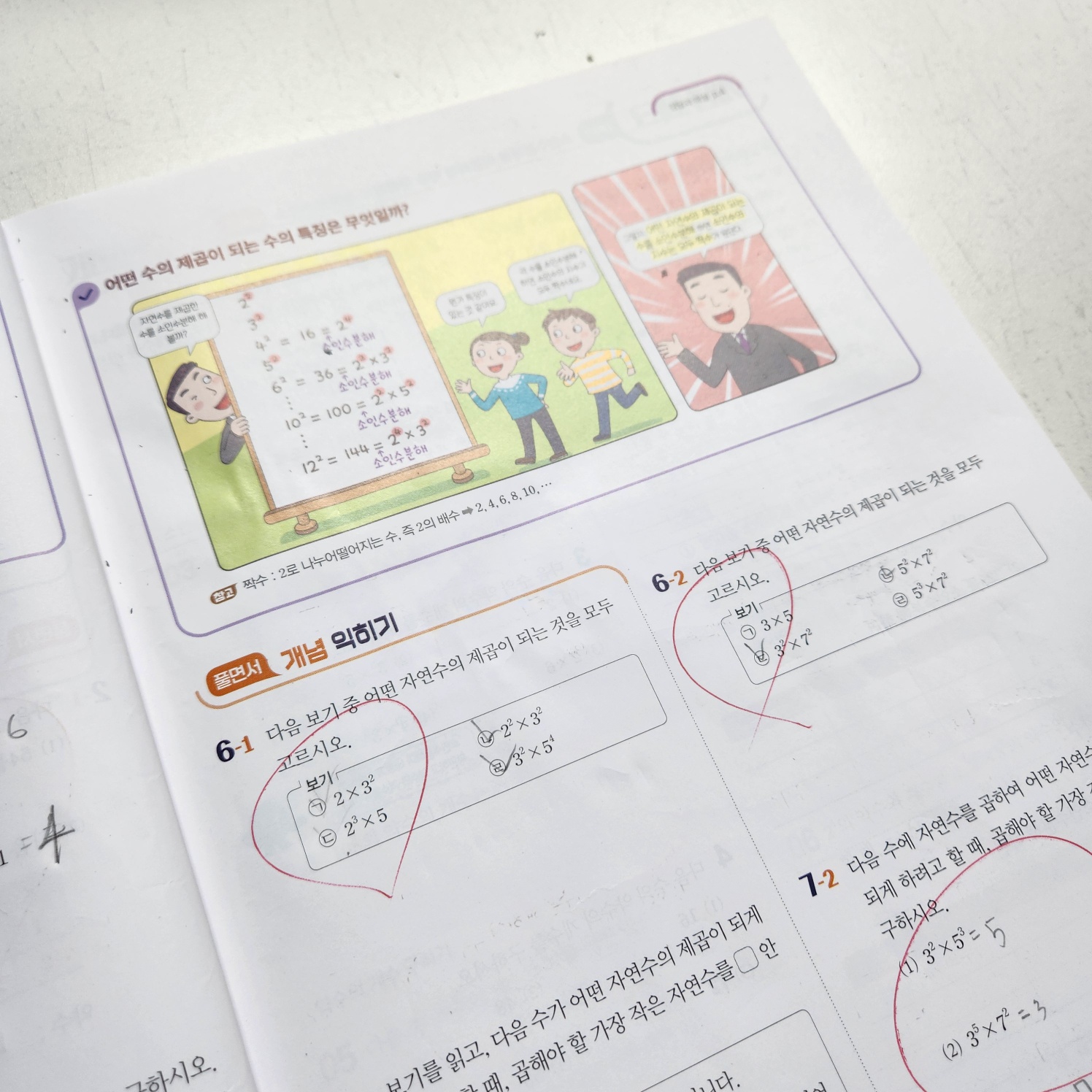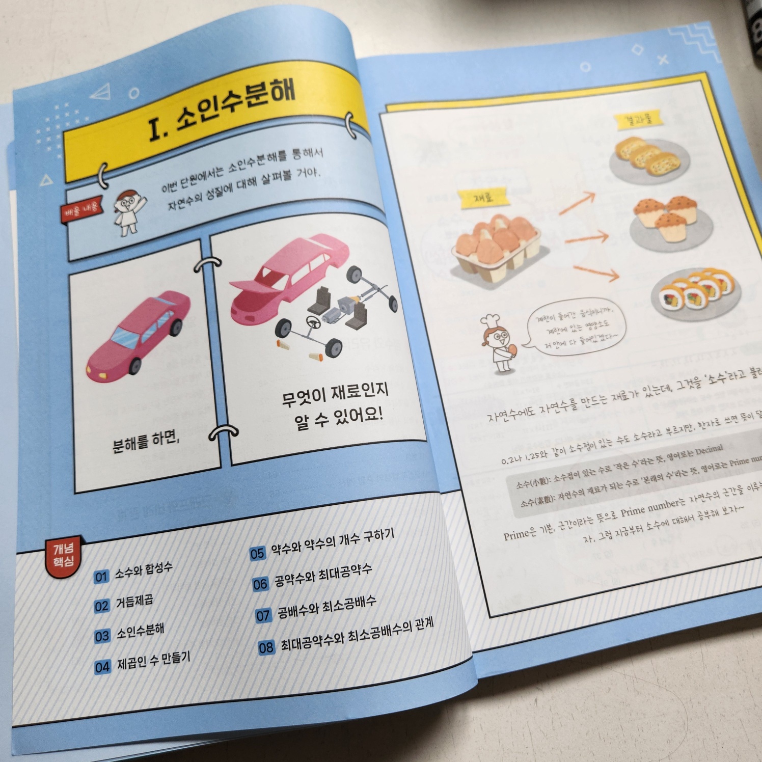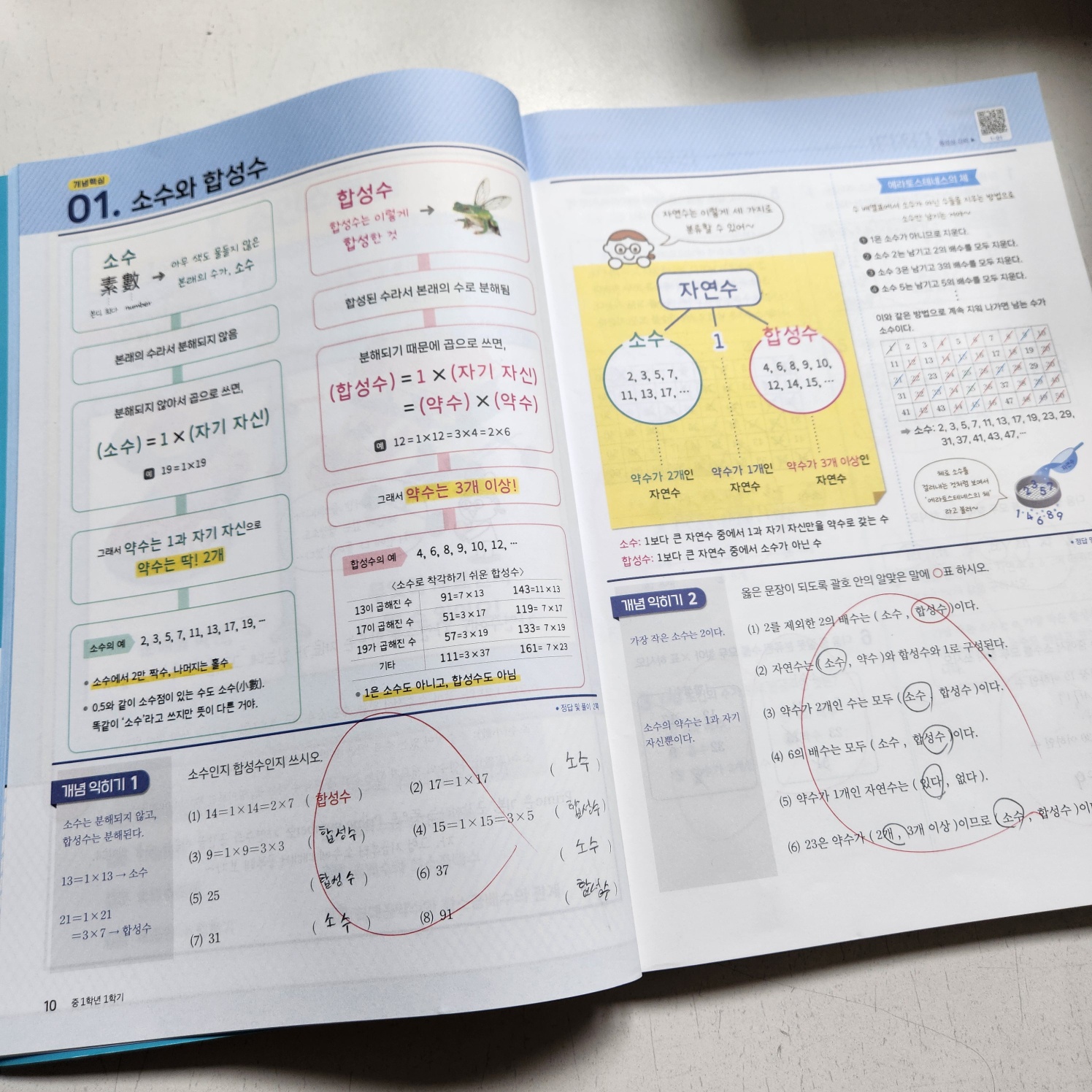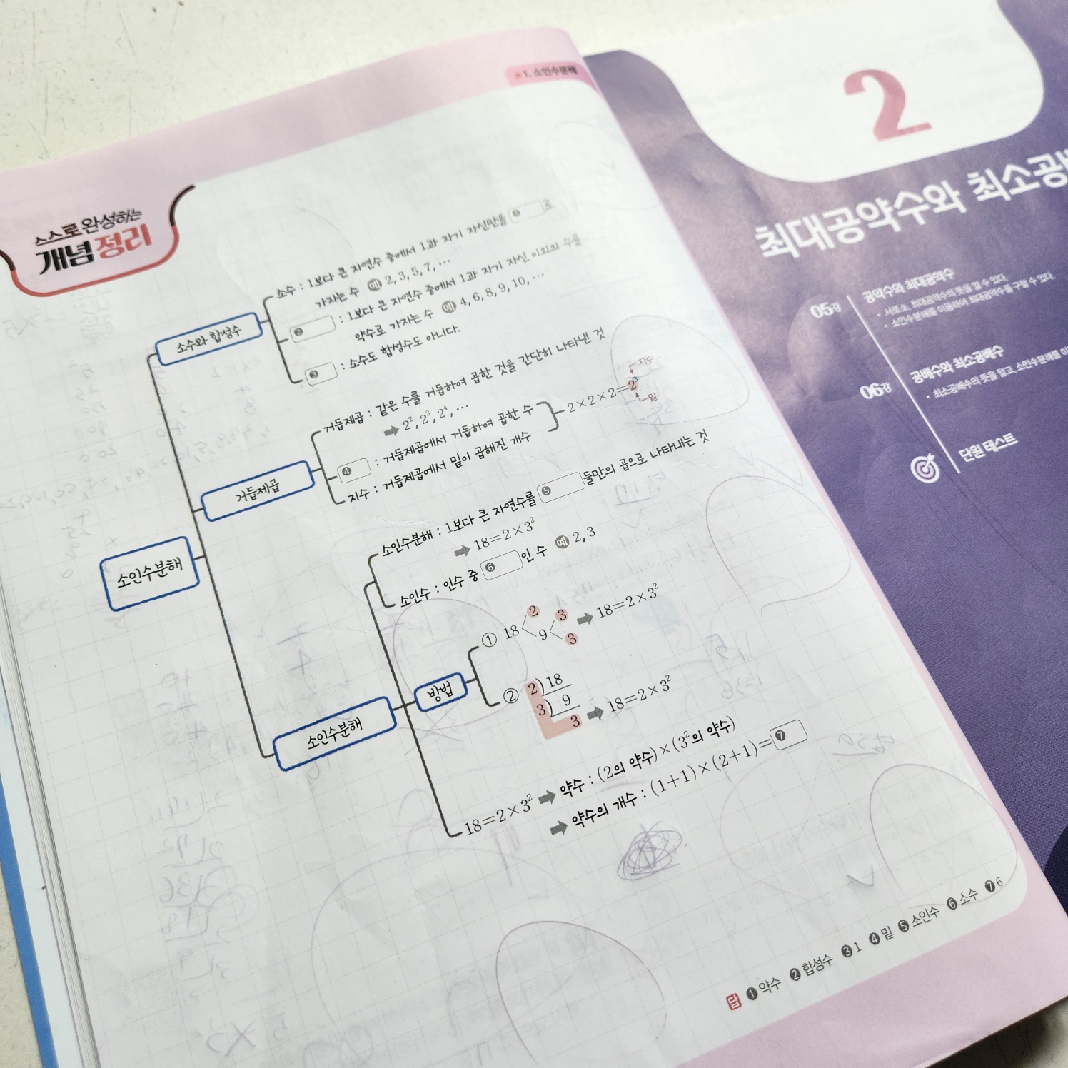 중학수학 예습을 시작했어요. 중학수학을 배운다고 하니 들뜬 마음도 한가득이지만 막상 시작하니 어렵다는 말을 해요.좀더 쉽게 다가갈 수 있는 교재가 없을까 고민하던차에 키출판사의 [그림으로 개념잡고 문제로 내신잡는 중등수학 1-1]을 알게 되었어요. 아이가 평소 공부할 때도 그림을 그리고 정리를 하면서 학습을 해서 도움이 많이 될거 같다는 생각이 들었어요.그림으로 소인수분해의 의미를 쉽게 알아갈 수 있었어요. 소인수분해가 무엇인지 이해를 하고 난 후 소수, 합성수 등 중등 수학 용어의 의미를 꼼꼼히 짚어갈 수 있었어요.아이도 개념 설명을 꼼꼼히 읽고 개념 문제를 풀어보면서 수학개념을 꼼꼼히 짚어갈 수 있었어요. 개념 문제를 꼼꼼히 짚어보고 난 후 '학교 시험 준비하기'에서 아이가 개념이해를 잘 이해했는지 짚어갈 수 있었어요.중등수학 첫 시작을 차근차근 꼼꼼히 짚어갈 수 있어 아이와 활용하기 좋은 교재였어요.