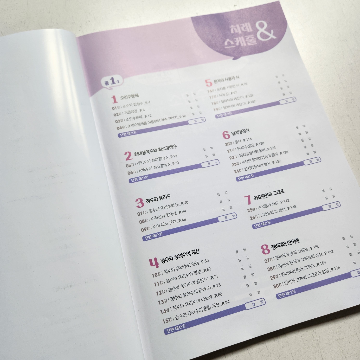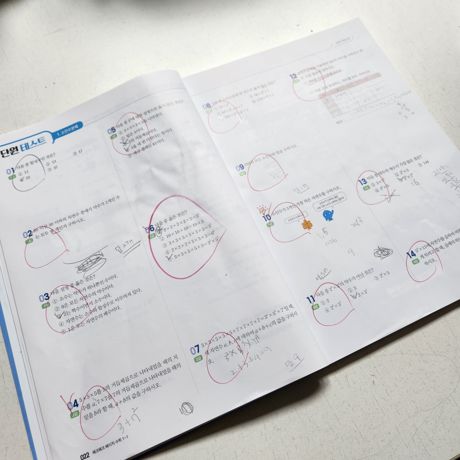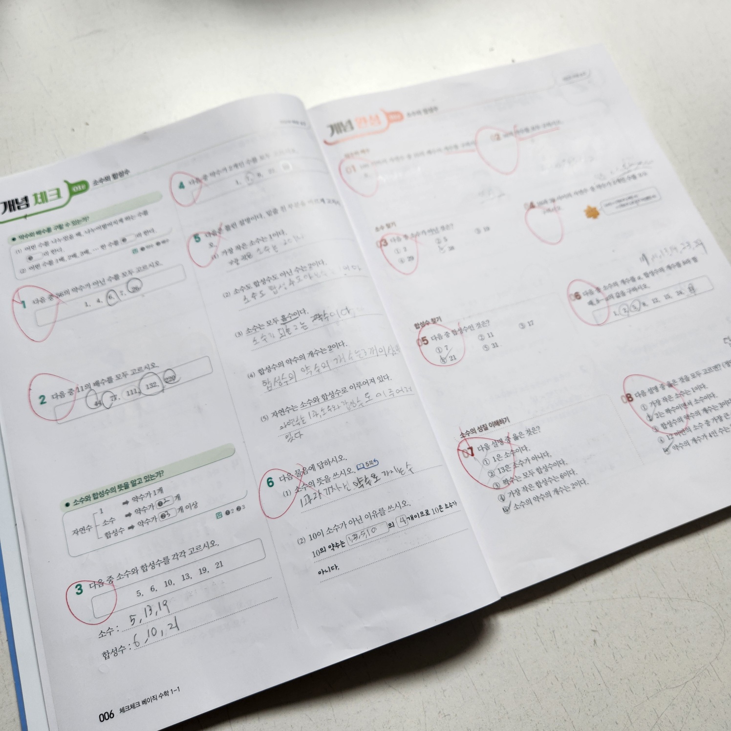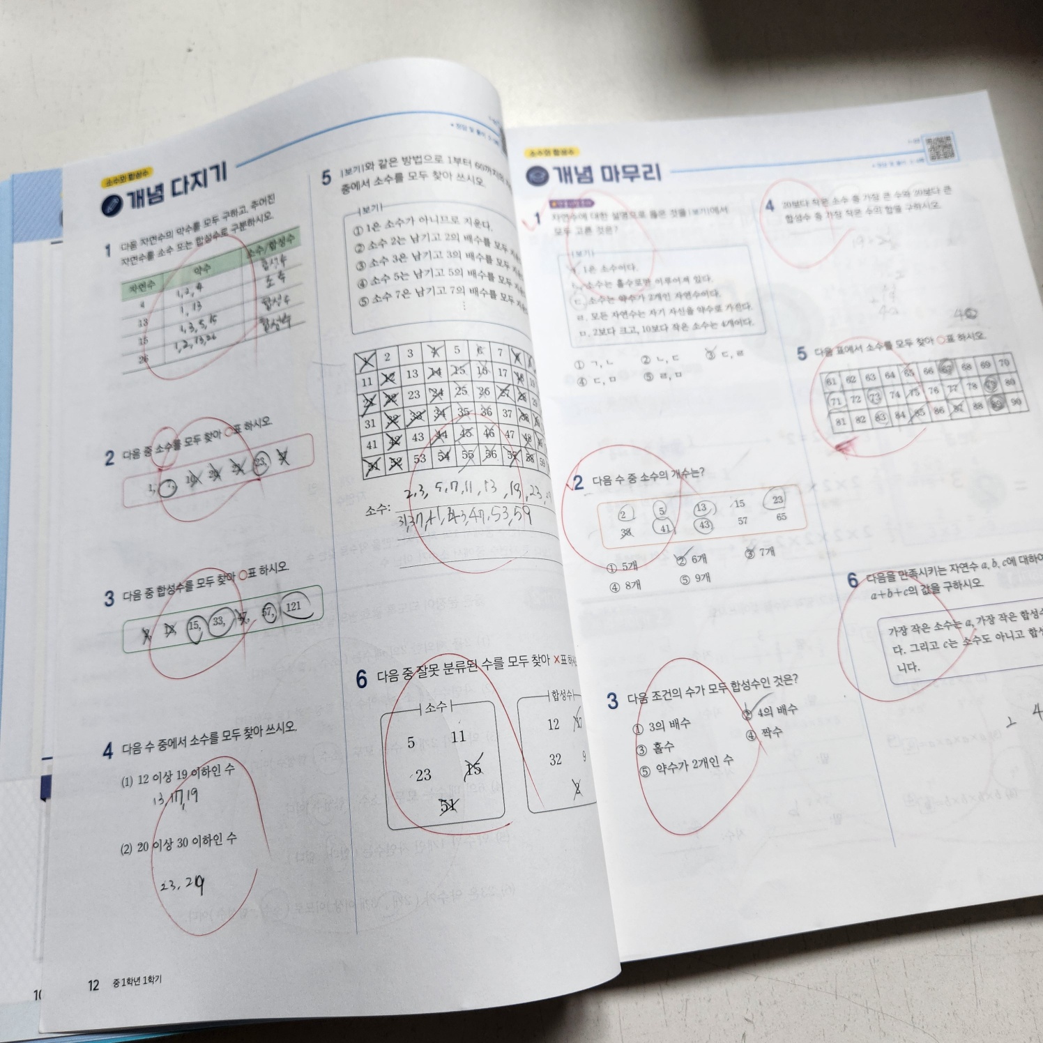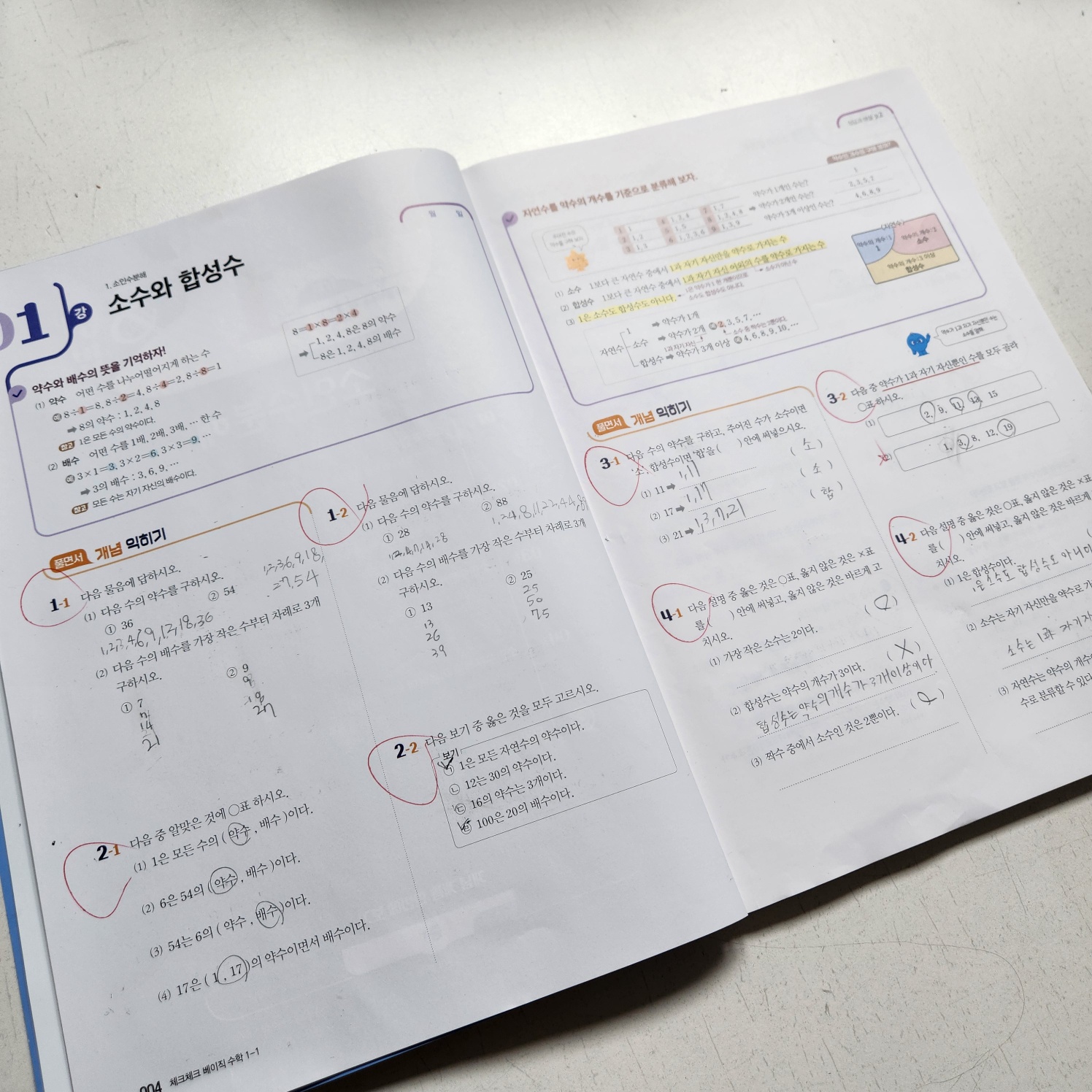 중학 입학을 앞둔 아이에요. 현행 위주로 학습을 하고 중등수학 예습을 시작했어요. 개념이해부터 차근차근 잡아주고 싶어서 체크체크 베이직 중학수학 1-1로 중학 수학학습을 시작했어요. 아이는 개념 이해가 쉽고 눈에 잘 보이게 정리가 잘 되어 있어 좋다고 해요.개념익히기-개념체크-개념완성-단원테스트 순서로 30강으로 구성이 되어 있어요. 기초 개념을 아이가 잘 이해할 수 있도록 문제가 구성이 되어 있었는데요. 아이가 개념 설명을 읽고 문제를 풀어가면서 내가 잘 이해했는지 체크하며 문제를 풀어갈 수 있어 좋았어요. 문제를 풀어보면서 개념을 머릿속으로 정리해 나갈 수 있었어요.기초 개념 학습이 잘 되어 있지 않으면 다른 문제를 풀때 안풀려 많이 힘들어 해요. 문제를 풀어가면서 소수, 합성수, 소인수분해, 서로소 등의 수학 개념을 이해했고 다른 유형의 문제를 풀어보면서 어떻게 풀어가야 하는지 짚어갈 수 있었어요. 한문제씩 풀리니 아이가 중학수학에 흥미가 조금씩 더 높아지는걸 느낄 수 있었어요.1강 소인수분해를 모두 풀어보고 단원테스트 문제를 풀면서 아이가 잘 이해하지 못한 문제는 앞의 개념설명을 다시 읽어보고 문제를 풀어보았어요. 개념을 잘 잡아놔서 그런지 오답이 많이 줄어서 아이가 자신감 있게 다가갈 수 있었어요.그리고 개념 정리하는 시간을 가져보면서 1강학습을 마무리 했어요. 처음 중학수학을 시작하는 아이에게 좀 더 쉽게 다가갈 수 있었는데요. 흥미를 가지며 중학수학 학습을 시작하라 수 있어 좋았어요.