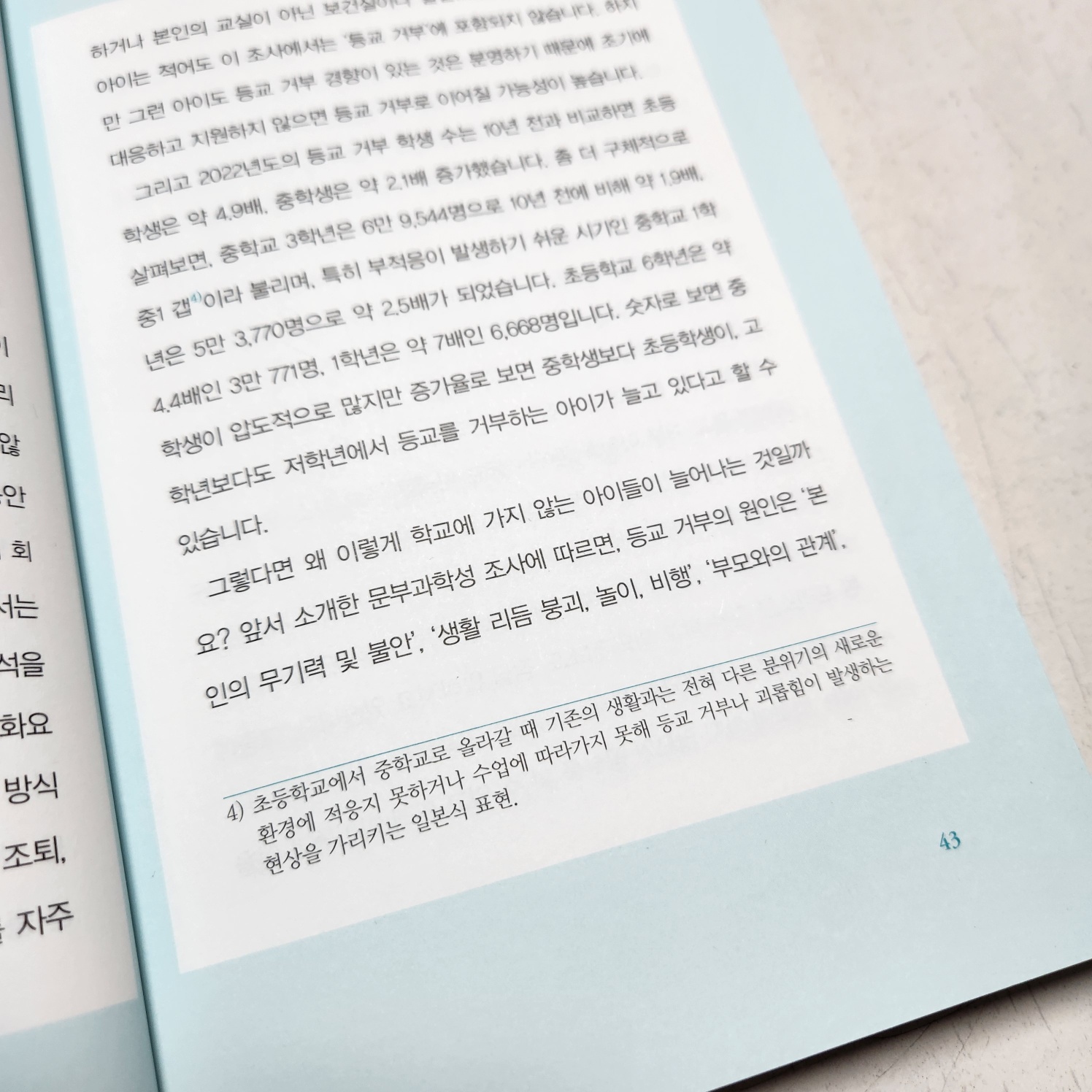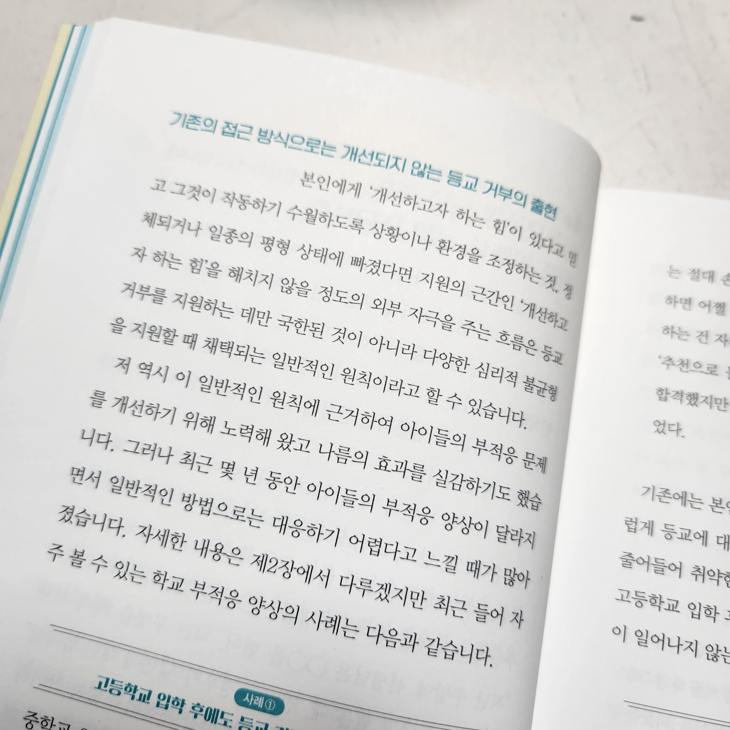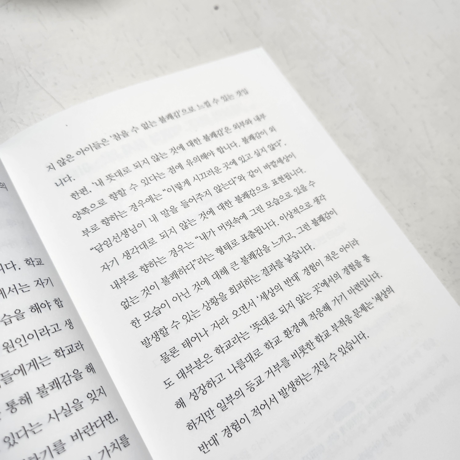 제목이 눈에 띄었어요. 아이들의 자존감을 위해 칭찬을 해줘야 한다 칭찬에 인색해지면 안된다라는 말을 자주 들었어요. 아이가 성장하면서 옳은 행동과 그러지 않은 행동을 할 때 어떻게 훈육을 해야하는지에 대한 고민이 깊어져요. 아이들이 성장하면서 많은 것을 경험하고 생각하며 큰다고 생각을 해요. 그 방향을 잘 잡아주는 것이 필요하다고 생각해요. 그 방향을 잡아주는 것이 쉽지 않고 어떻게 해야하는지 고개를 갸우뚱 할 때가 많은데요. 이 책은 다른 부분에서 생각을 할 수 있어 좋았어요. 등교를 거부 하는 아이들, 불쾌감, 거부감, 아이와의 관계 등에 대한 생각을 깊이 하게 되었어요.학교 가는 것이 제일 재미있다고 말을 하는 아이이지만 학교에서 친구와의 관계 선생님과의 관계 속에서 어느 순간 달라질 때가 있어요. 그 관계가 해결되지 않았을 때 오는 스트레스와 그것을 해결해 나가는 과정에서 부모가 해야하는 행동에 대한 고민을 깊이 한적이 있어요. 그렇게 하나씩 잘 해결해 나갈 때 깊은 안도를 느낄 때가 있어요. 앞으로 수많은 경험을 하게 되는데요. 이 책을 읽으면서 부모가 아이를 어떻게 바라봐야 하고 어떤 자세를 취해야 할지에 대해 깊이 생각해 볼 수 있었던 시간이였어요.