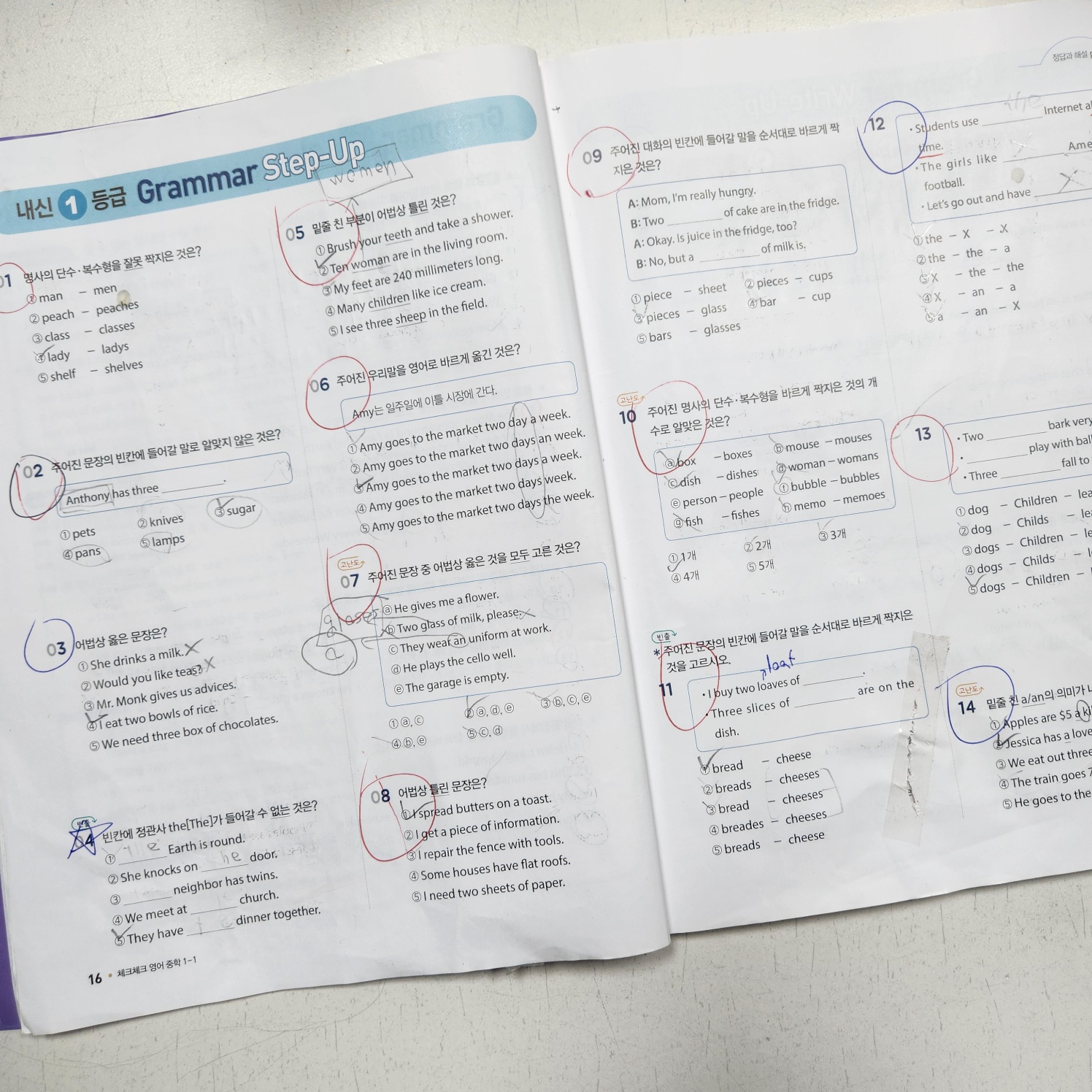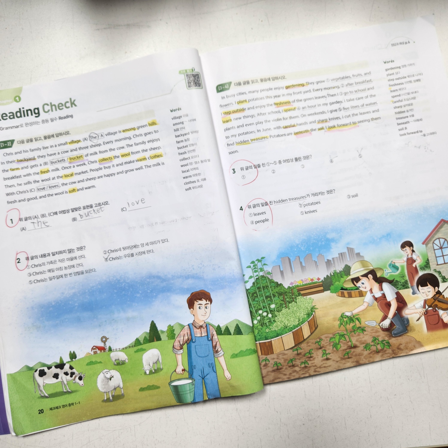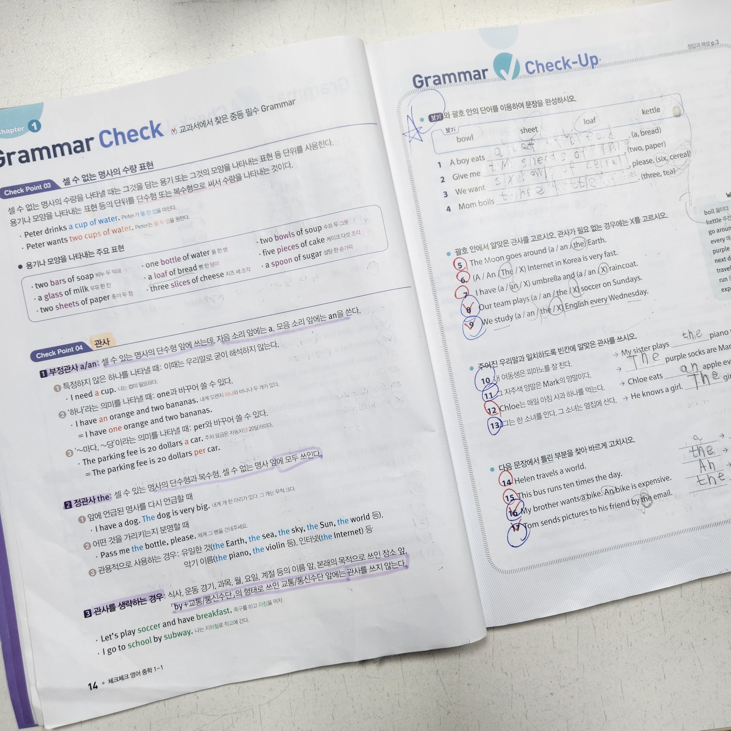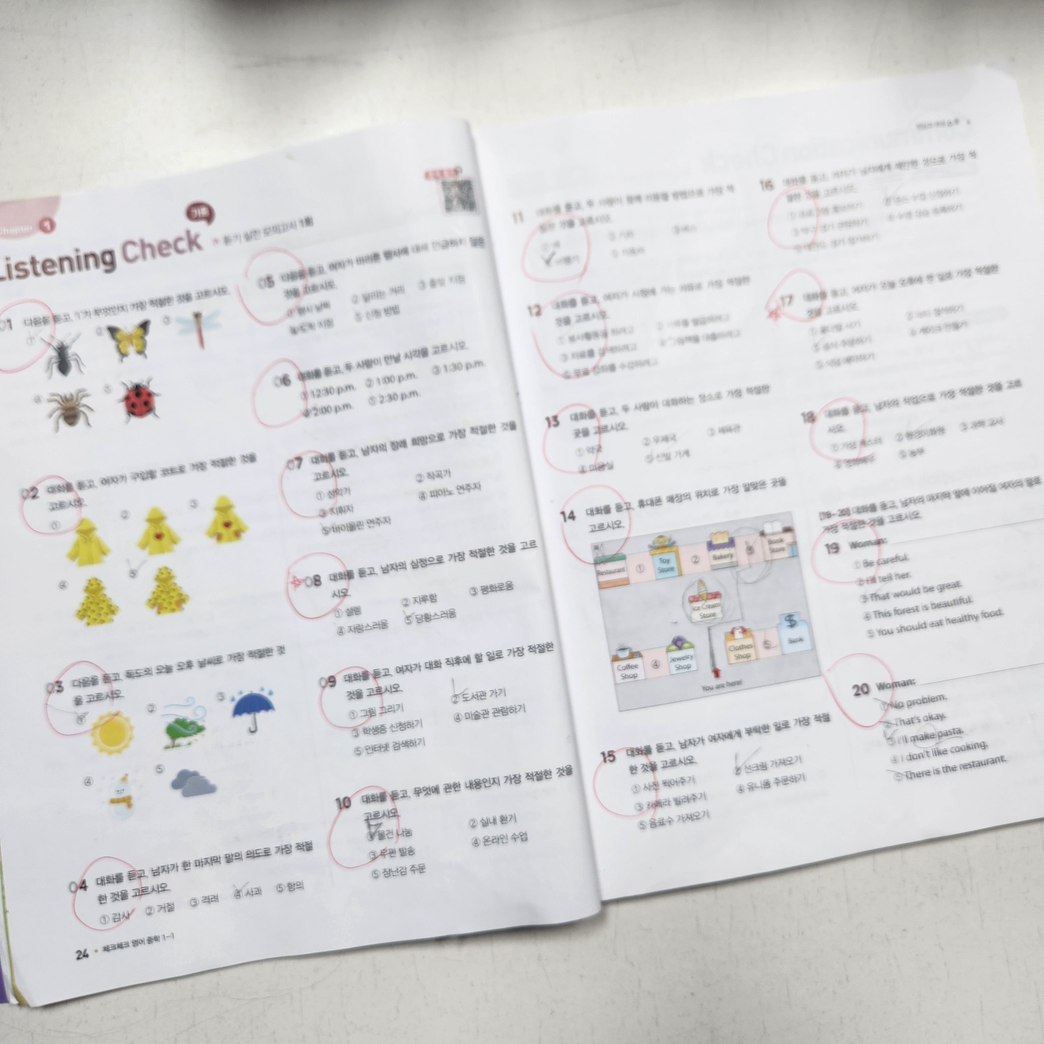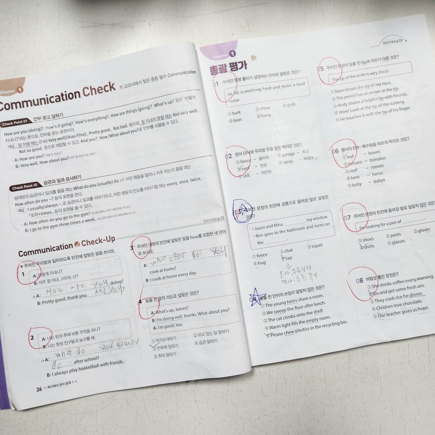 중학 입학을 앞두고 중학 교과 예습을 시작했어요. 수학은 시중교재에서 아이가 원하는 교재로 선택을 했는데요. 영어는 어떤 교재로 시작해야 할지 고민이 많이 되었어요.체크체크 바로시리즈를 풀어보고 난 후라 천재 교재를 살펴보면서 학기 교재로 체크체크 중학영어 1-1을 시작했어요.체크체크 영어 1-1은 어휘, 문법, 듣기, 독해, 생활영어. 중1 교과서를 바탕으로 꼭 알아야 하는 부분을 담아두었어요.아이가 어휘와 문법에 많이 약한데요. 아이가 부족한 부분을 채워나가며 차근차근 학습을 할 수 있어 좋았어요.중1 아이들이 꼭 알아야 하는 단어를 주제별로 담아놓았다고 해요. 가정생활 주제의 어휘를 외우고 연습문제를 풀어보면서 잘 알고 있는지 체크해 볼 수 있었어요.문법을 초등때 학습을 했지만 다시 학습을 하니 잊은 부분도 많이 있었어요. 그 부분을 다시 체크하고 외우고 난 후 문제를 풀어보았어요.시험대비 문제를 풀어볼 수 있었어요. 처음 아이가 쓰기가 어렵다는 말을 많이 했는데요. 앞에서 배운 문법을 다시 읽어보며 차근차근 풀어보니 "아~이렇게 풀면 되는구나"라고 말을 하는 아이였어요. 처음 배운 어휘를 바탕으로 한 재미있는 글을 만날 수 있었어요. 다양한 글을 읽으면서 독해를 해 보고 문제를 풀어볼 수 있었어요. 아이는 모르는 어휘를 체크하며 글을 읽고 문제를 풀어보았는데요. 어휘를 체크하고 QR코드로 영어듣기를 하면서 글에 좀 더 집중하는 시간을 가져볼 수 있었어요.영어듣기와 총괄평가를 통해서 앞에서 배운 부분을 다시 짚어보고 모르는 부분을 다시 학습을 하면서 영어학습을 할 수 있었어요. 생활영어는 읽고 어떻게 활용하면 되는지 직접 말을 해보며 학습을 했어요. 잘 이해가 안가거나 모르는 부분은 체크를 해두고 답지를 꼼꼼히 읽어보며 내가 어떤 부분에서 이해를 못했는지 체크해 보았어요. 체크체크 영어 정답지에 해설이 너무 잘 나와 있어서 도움이 많이 되었어요.권말에는 아이가 다시 풀어볼 수 있는 Practice Book이 있어요. 어휘, 문법, 듣기 등 앞에서 배운부분을 꼼꼼히 체크할 수 있어서 복습하는 시간을 가져볼 수 있어 좋았어요. 중학영어학습 어떻게 해야할지 고민이 많았는데요. 체크체크 중학영어 1-1로 꼼꼼히 학습할 수 있을거 같아요. ^^