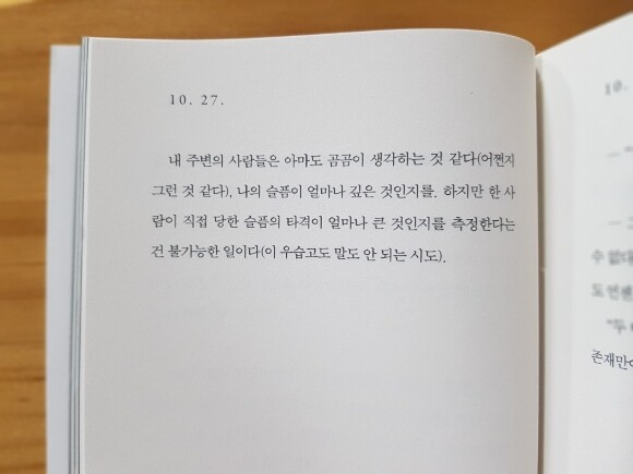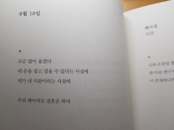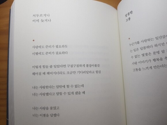 사람을 만나 사랑에 빠지고 이별해서 힘든 과정들이 페이지마다 꾹꾹 눌러 써져 있다. 화려한 미사여구나 지나친 은유, 비유가 아니어서 더 와닿는다. 진심으로 느껴진다. 사랑의 기쁨도 매우 진지하게 느껴졌고, 헤어짐의 슬픔도 한층 승화된 느낌으로 다가왔다. '어른의 사랑'처럼 느껴진 이유이다.