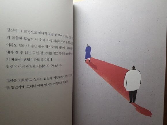 중간에 이런 느낌의 일러스트가 함께 나와서 글에 몰입하는 데 도움을 준다. 특히 이 장면, 어디선가 많이 본 듯한 느낌이었는데, 바로 내가 딱 이 장면처럼 이별을 했던 기억이 난다. 스틸사진처럼 각인된 그 장면을 그림으로 보게 되니 옛 감정이 꿈틀꿈틀 살아난다. 감성 제로였던 내 마음밭에 비가 내린다.