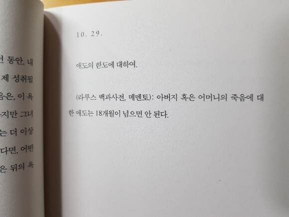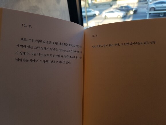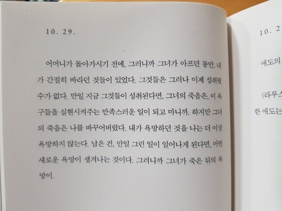 가장 눈에 띄는 건 마침표가 맨 마지막에만 찍혀 있고, 수많은 문장이 마침표 없이 쭉 연결되어 있다는 것이었다. 숨쉴 틈 없는 작가의 혼란스런 마음을 반영한 걸까. 처음엔 어색했지만 계속 읽다보니 독자인 나의 호흡대로 알아서 끊어서 읽게 되는 효과가 있었다.