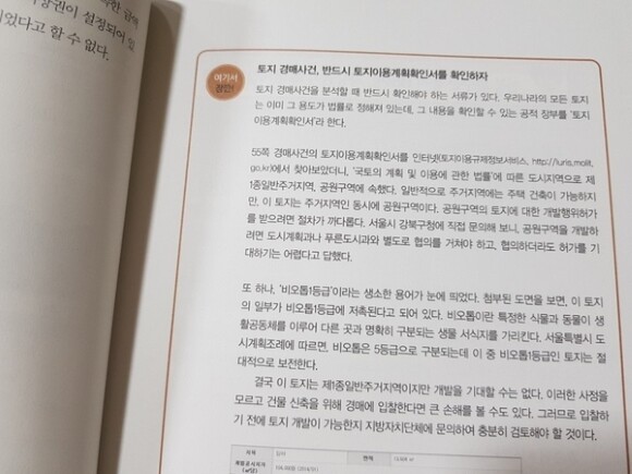 가장 유용했던 건 중간중간 실제 경매 사건을 보여주고, 이를 권리분석한 내용이었다. 아무리 이론으로 탄탄하게 무장해도 실제로 응용이 되지 않는다면 무용지물이기 때문이다. 언제 어디에 있는 물건인지 알려주고, 여기서 유념해야 할 사항이 무엇인지, 왜 낙찰을 받지 않았는지, 이런 경우 입찰에 참여하는 게 맞는지, 일반인들은 모르는 함정은 없는지 꼼꼼하게 체크한 게 가장 좋았다.
