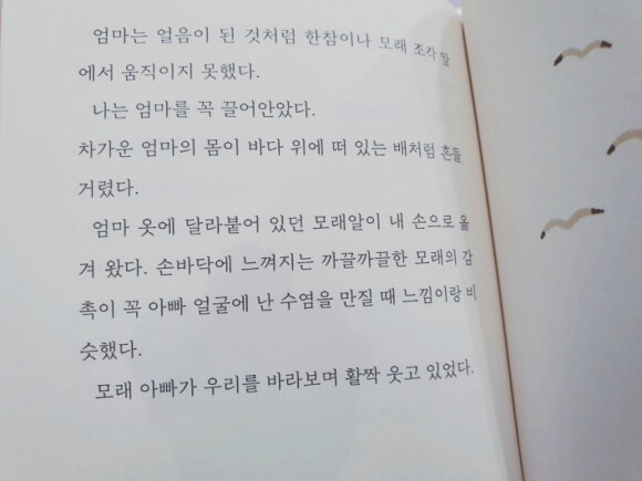 할머니랑 둘이 살던 귀정이도, 파도에 엄마를 잃은 소라게도, 모래에 조각된 아빠를 보며 그리워하던 준이도, 엄마의 반지를 대신 만들어줬던 남정이도... 모두 우리 주변에서 흔히 만날 수 있는, 살아있는 인물들이었다. 엄마와 아빠를 잃은 슬픔을 달래는 어린 마음이 어찌나 안타깝고 슬펐는지.