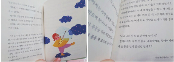 11편의 동화가 모두 재미있었지만, 아이는 '소라게'를, 나는 '나는 우산입니다'를 여러 번 읽었다. 투명우산의 목소리로 듣는 세상 이야기. 어쩜 이런 생각을 했지? 작가의 상상력에 놀랐다. 비바람에 휩쓸려 망가진 투명우산은 결국 쓰레기장으로 갔는데, 이를 잡은 할아머지의 혼잣말이 마음을 울렸다.