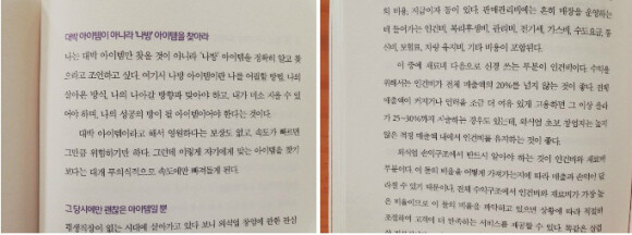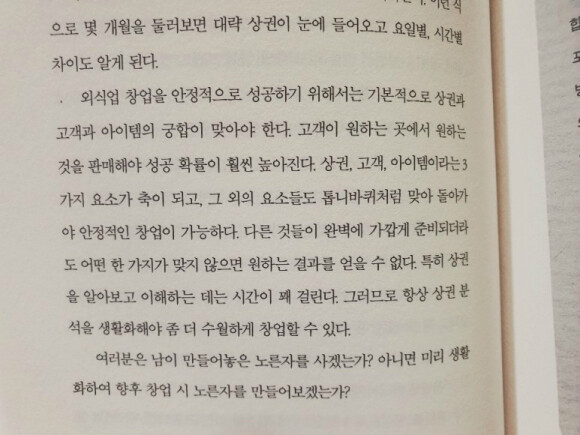 또 한 가지는, 초보 창업자가 자칫 놓치기 쉬운 점을 '경험자'의 입장에서 조언을 해줬다는 점이다. 모르면 당할 수밖에 없는 권리금, 인테리어, 세금, 월세, 입지, 비용 등등... 어느것 하나도 허투루 넘기지 않고, 하나하나 꼼꼼하게 챙기는 저자의 성격을 엿볼 수 있었다. 그래야 성공하는 거겠지.