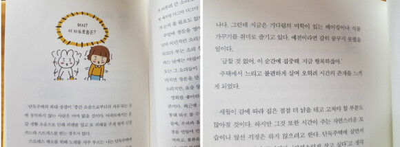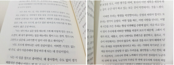 구체적으로 어떤 꿈, 어떤 공부를 하고 있는지에 대해서는 나와 있지 않지만, 꿈을 이루기 위해 달려가는 마음과 놓고 싶은 마음이 교차되어 많은 내적 갈등과 고민이 드러나는 부분이 많았다. 누구나 그렇지 않을까. 좋아하는 것과 해야 하는 것의 괴리감. 그리고 좋아하는 것과 돈 버는 것 중 하나를 골라야 할 때의 난감함. 그런 고민들이 이 책에 고스란히 녹아 있다.