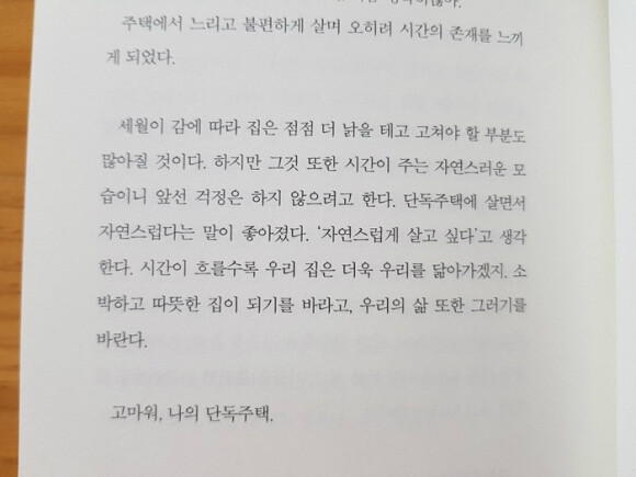 세월이 감에 따라 집은 점점 더 낡을 테고 고쳐야 할 부분도 많아질 것이다. 하지만 그것 또한 시간이 주는 자연스러운 모습이니 앞선 걱정은 하지 않으려고 한다. 단독주택에 살면서 자연스럽다는 말이 좋아졌다. ‘자연스럽게 살고 싶다고 생각한다. 시간이 흐를수록 우리 집은 더욱 우리를 닮아가겠지. 소박하고 따뜻한 집이 되기를 바라고, 우리의 삶 또한 그러기를 바란다.