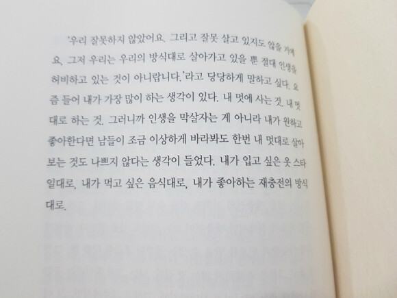‘우리 잘못하지 않았어요. 그리고 잘못 살고 있지도 않을 거예요. 그저 우리는 우리의 방식대로 살아가고 있을 뿐 절대 인생을 허비하고 있는 것이 아니랍니다.’라고 당당하게 말하고 싶다. 요즘 들어 내가 가장 많이 하는 생각이 있다. 내 멋에 사는 것. 내 멋대로 하는 것. 그러니까 인생을 막살자는 게 아니라 내가 원하고 좋아한다면 남들이 조금 이상하게 바라봐도 한번 내 멋대로 살아보는 것도 나쁘지 않다는 생각이 들었다. 내가 입고 싶은 옷 스타일대로, 내가 먹고 싶은 음식대로, 내가 좋아하는 재충전의 방식대로.
