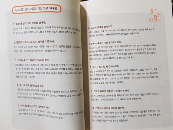 책을 펼치면 '우리아이 경제교육을 위한 부모 10계명'이 나오는데, 이 내용이 참 좋다. 그래서 별도로 찍어두고 나중에 따로 출력을 해놔야겠다. 아이의 경제교육을 시키기 전에, 부모가 솔선수범을 보이는 게 당연하지만 어떻게 실천해야 할지, 무엇부터 시작해야 할지 잘 몰랐는데 이렇게 구체적으로 알려주니 당장이라도 실천할 수 있겠구나.
