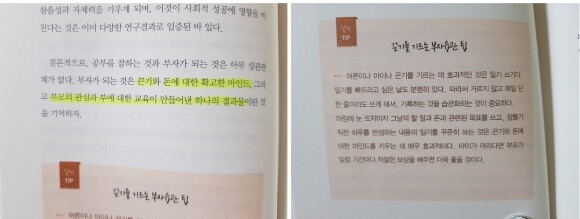 <우리아이 부자습관>을 보면서 밑줄을 친 부분이 무척 많았는데, 그만큼 내용이 알찬 것도 있고, 포스트잇 형태로 꼭 알아야 팁을 다양하게 소개해서 매우 유용한 부분이 많았다. 처음엔 이 책이 아이의 올바른 경제습관을 길러주어 부자로 만들어 주는 책이겠구나 싶었는데, 막상 다 읽고 나니 자녀의 경제교육은 물론, 미래먹거리에 관한 전망을 알려주어 여러모로 도움이 되는 책이다.