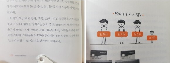 아이의 용돈을 막무가내로 모으는 것이 아니라 나름대로 분산투자(?)를 해야 한다는 것도 인상깊었다. 일명 3:3:3:1의 법칙인데, 전체 용돈의 30%는 투자, 30%는 저축, 30%는 소비, 10%는 기부를 하는 것이다. 무조건 모으는 게 정답이 아니라 '투자'를 통한 가치의 재창출이 눈에 띄었고, 10%의 기부도 꼭 필요한 항목이라는 것에 동의한다.