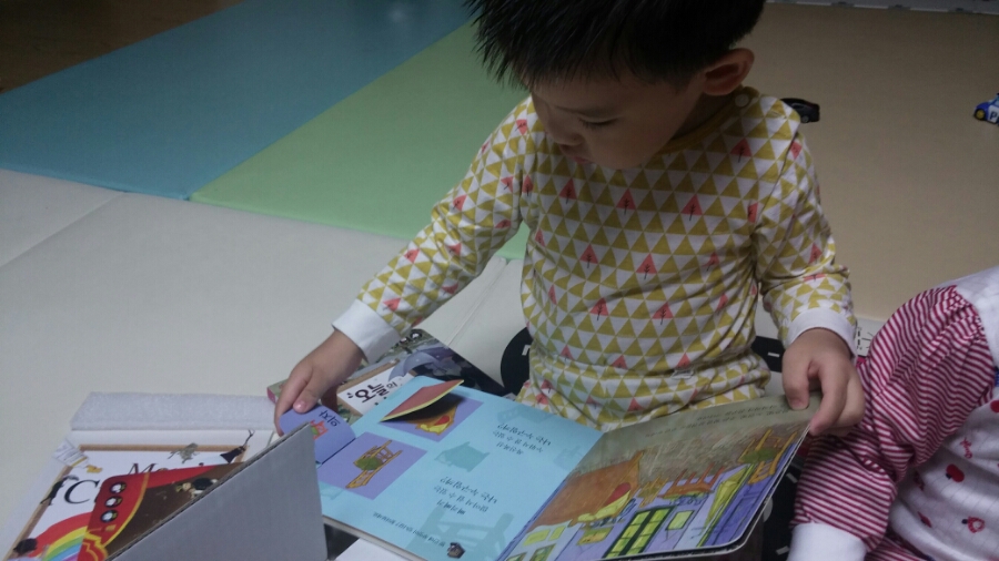 아이가 갑짜기 책박스를끌어안으며