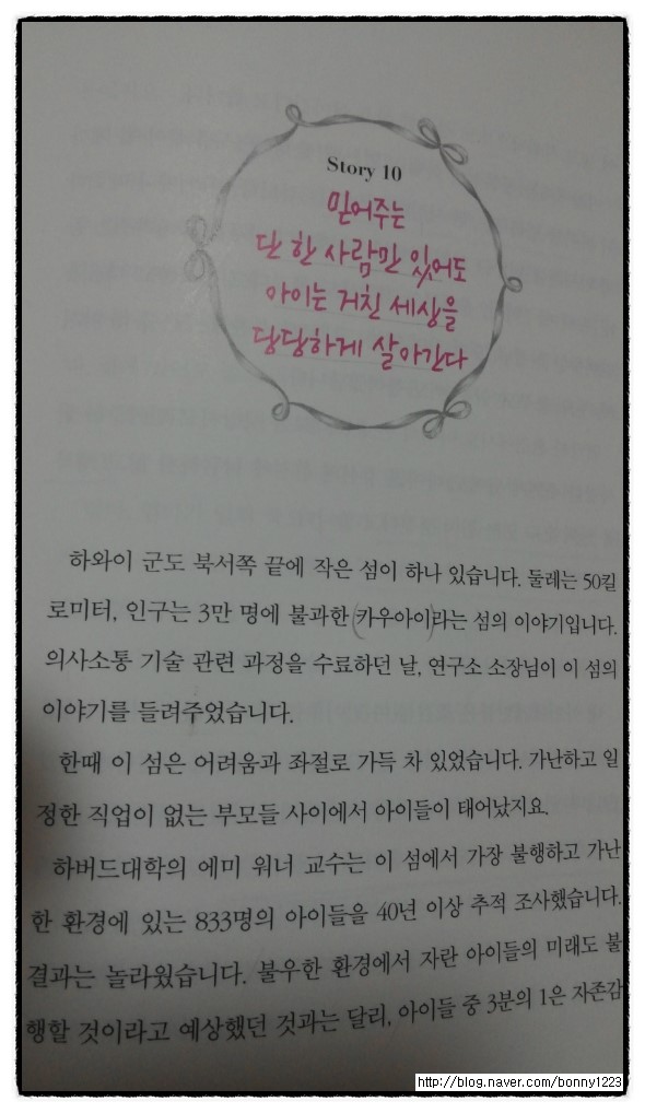 우리 아이들이 정말 힘들고 지칠 때..아무도 나의 편이 되어주지 않을 때도 엄마,아빠..아니 단 한 사람만이라도 나를 진실로 믿어준다면 그 사람은 세상을 굳건하게 잘 헤쳐나간다고 합니다. 우리는 엄마잖아요. 당연히 우리의 아이를 믿어야..믿고 지지지해줘야 하지 않을까요? 그런데 자꾸 실전에서는 깜박깜박인다는... 오늘도 다시금 깜박하지 말자고 다잡아봅니다.