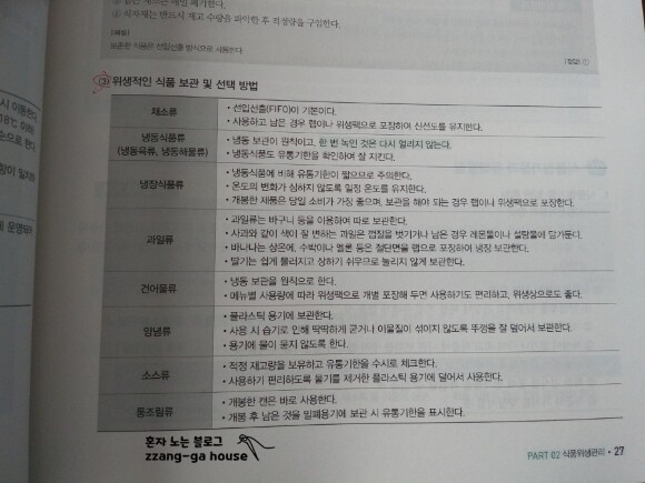 아주 기본적인 식품 보관 및 선택방법. 조리기구의 위생관리같은 내용도 담겨져 있어서 꼭 조리사를 준비하지 않아도 요리에 관심이 있다면 꽤 도움이 될 듯한 내용이 많았다.