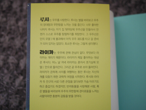 "빛의 속도 때문에 그런 거예요. 아무리 빨리 간다 해도 광속은 똑같아요. 그게 법칙이에요. 그러니까 오웬이 우리보다 상대적으로 월등히 빨리 날 수는 있지만 광속은 우리 모두에게 똑같다는 거죠. 무슨 말이냐 하면, 모든 계산을 다 끝내보면 시간과 공간 같은 것들이 굉장히 휘어 져버리는 거죠. 이해되나요?”- 본문 75쪽