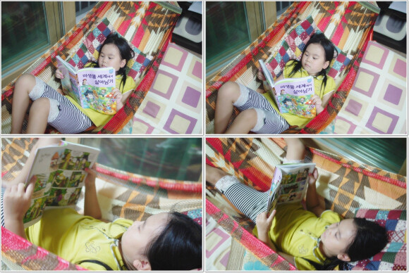 이날 해먹을 처음 설치한 때라서 불편했는지 자리를 바꿔서 꾸준히 읽어가고 있어요
