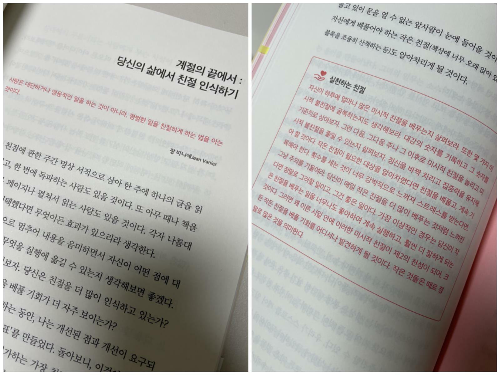 그리고 재밌는 것은 각 파트 속 / 챕터 속 / 소제목이 시작될 때마다, 친절에 관한 명언들이 하나씩 언급되면서 이야기가 시작된다. 그래서 그 명언을 가만히 생각하며 명상하는 것도 이 책을 읽는 방법 중 하나! 게다가 소제목 끝에는 /실천하는 친절/ 이라는 제목으로 짧게 내용을 요약해주면서 우리가 실천할 수 있는 친절의 방법을 제시해주고 있다. 상당히 알찬 구성이라고 할 수 있다.